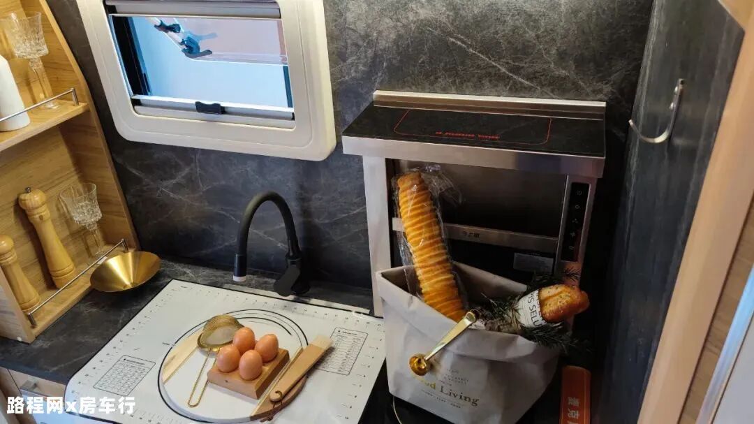 对侧厨房区采用整体式橱柜设计,电磁炉、微波炉、抽油烟机、洗水槽、水龙头等设施配备齐全,满足户外旅行烹饪所需。