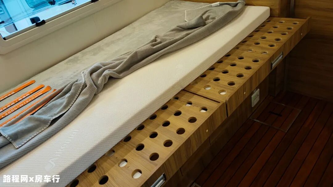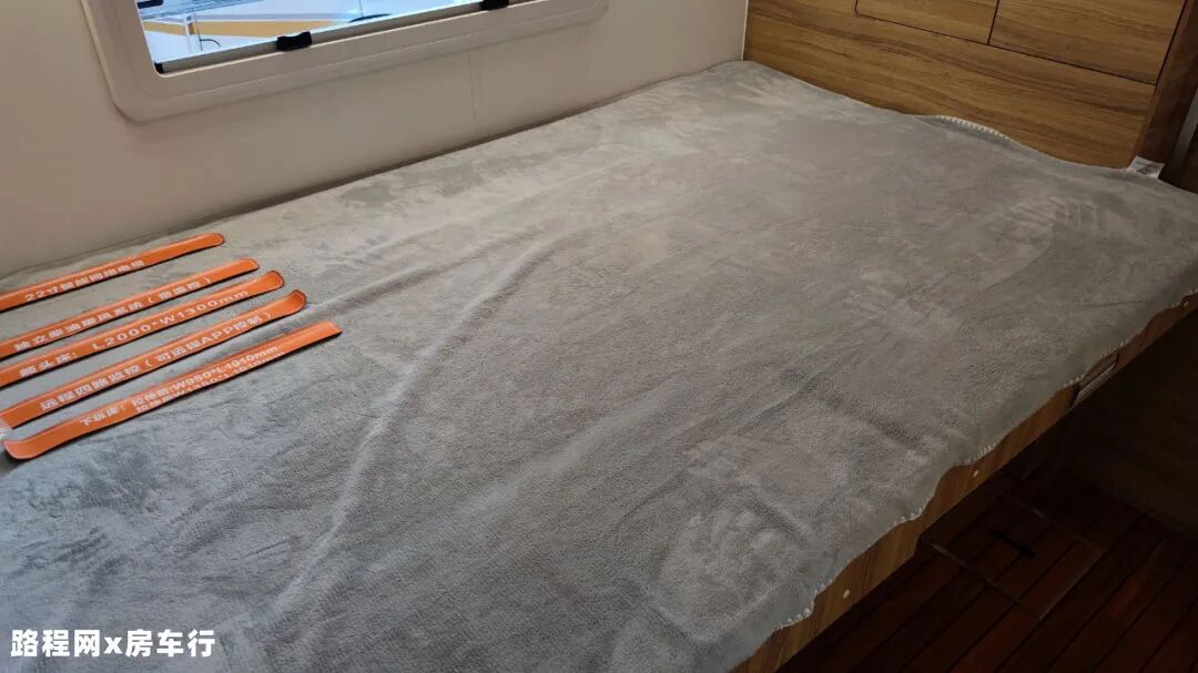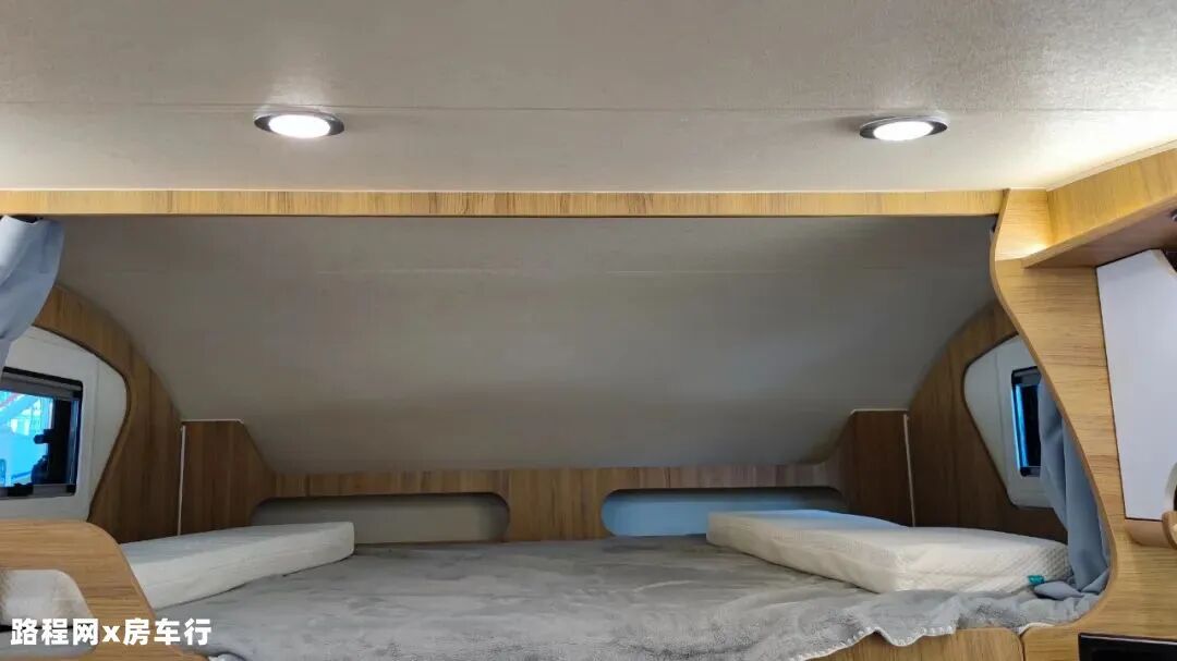 额头休息区设置了大尺寸双人床,尺寸为2000x1300mm,睡眠空间丰富;床铺两侧设置了车窗,保证日常采光通风,侧面还配有双人床爬梯、隐私帘、照明灯等生活设施。