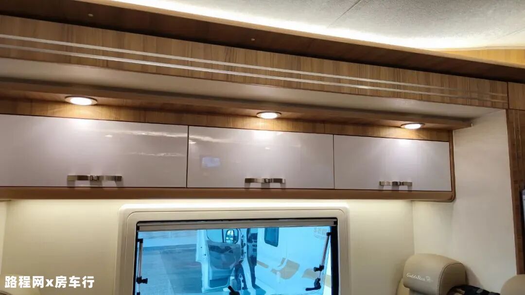 储物方面,卡座上方设置了一排吊柜,侧面还有照明筒灯,方便夜间取用物品。