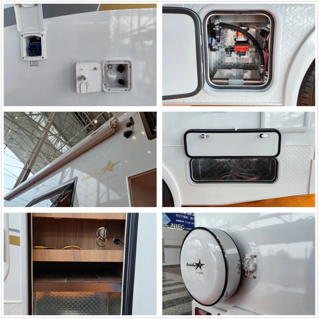 户外生活设施方面,新车配备了3.5米菲亚玛进口遮阳蓬+LED灯带、电源输入带外接电缆、室外隐藏式220V插座、室外灯带、进口食品级易维修快接水路、室外淋浴器等;车身两侧设置了丰富的储物舱,包括一个小的储物空间和带有两层储物格的储物舱,车尾还设置了备胎舱,可以装载备用轮胎。