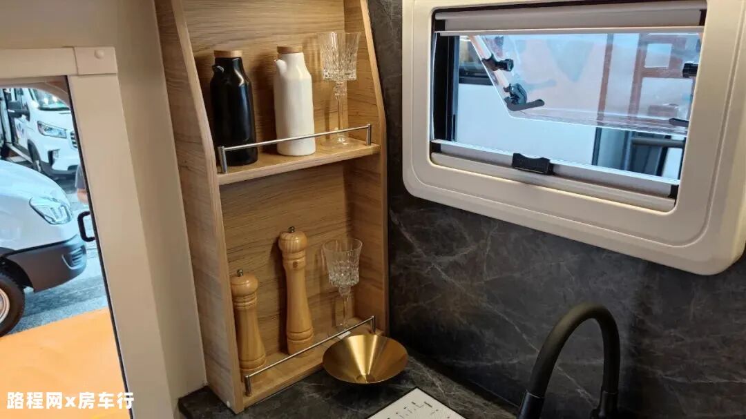 橱柜侧面设置了双层储物格,方便收纳厨房调味物品;旁边还设有外推窗,既保证了日常采光,也可以快速散去车内油烟味。