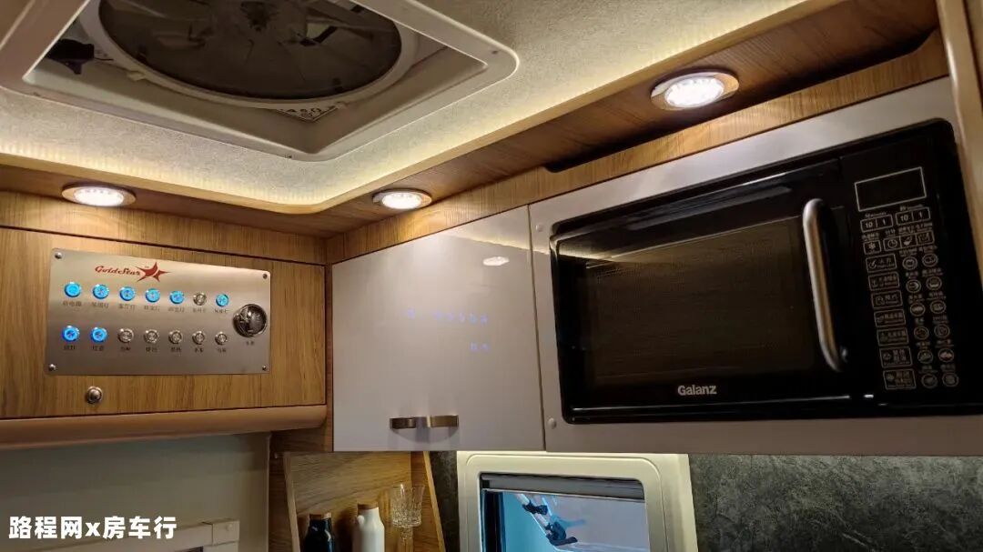 顶部配有一台微波炉,可以进行简单的食物加工,左侧设有储物吊柜,方便存放一些厨房的零碎物品;侧面是水电灯光控制开关系统,顶部还有双向换气扇,加快室内空气循环。