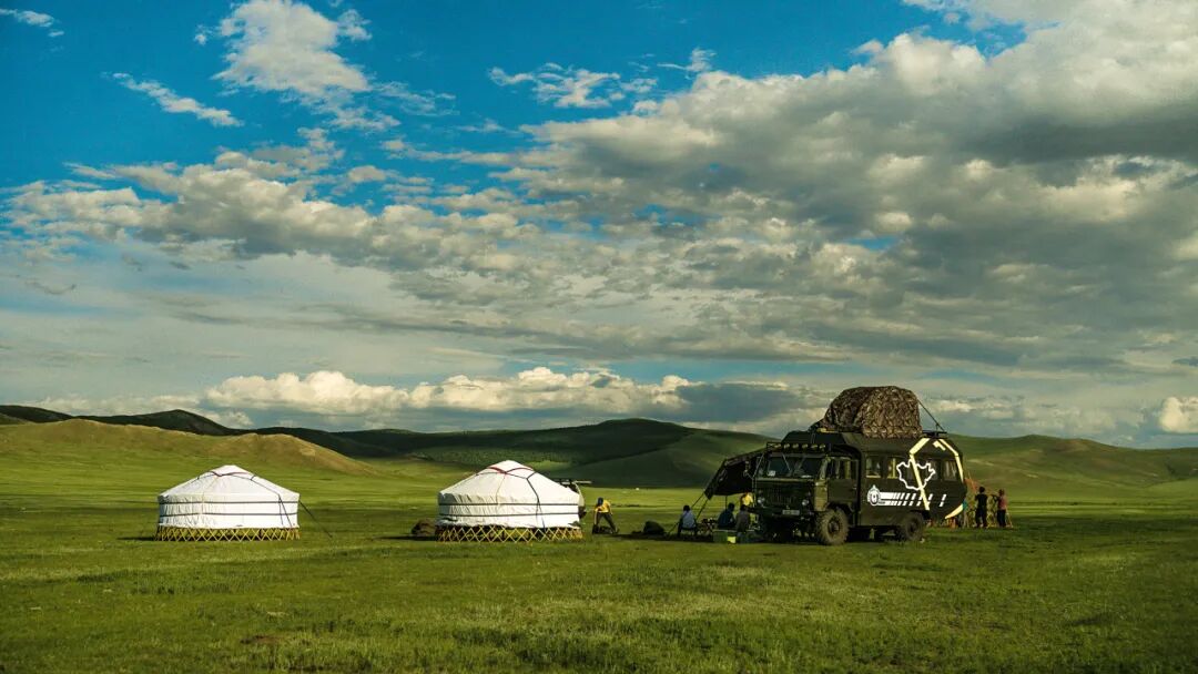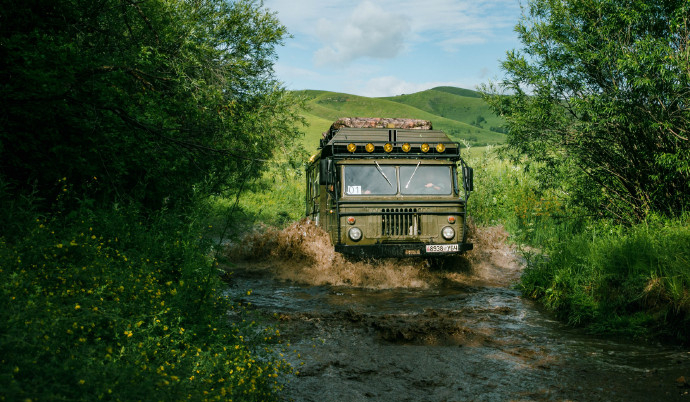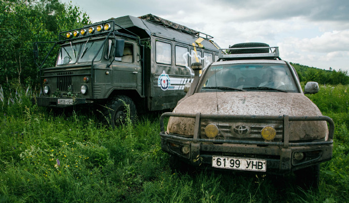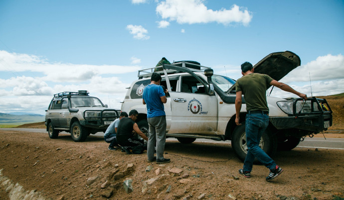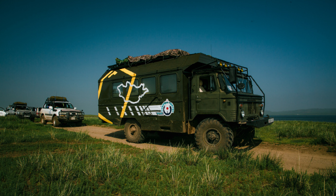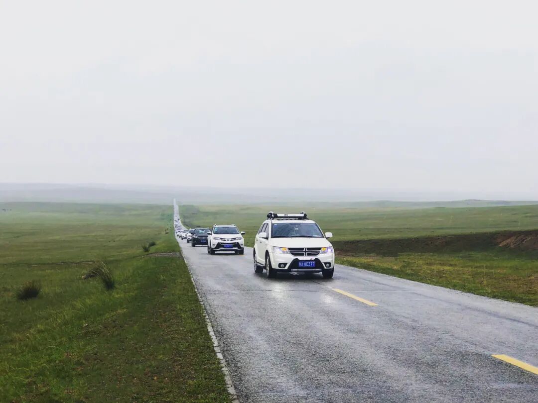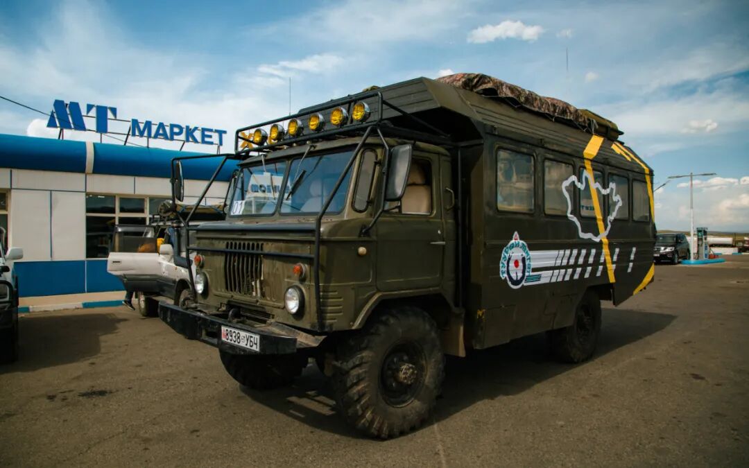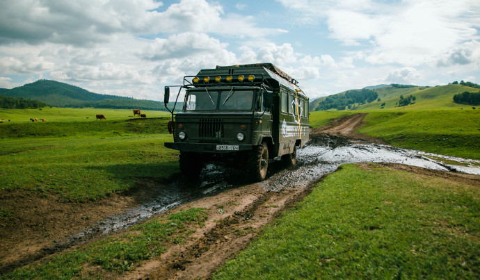 当日下午,我们在草原深处正式出发 ,先与我们的自驾车队在城外的加油站集合。作为本次自驾蒙古的主力军,车队集结了4辆越野车,还有一台来自俄罗斯的 66 当地改装车,被我们亲切的称之为“大宝贝”。别看它外表冷酷,实则是此次出行的“保姆车”,行程中的大部分水与食物,应急装备,便携蒙古包等都在此辆车上,做足了后勤保障。