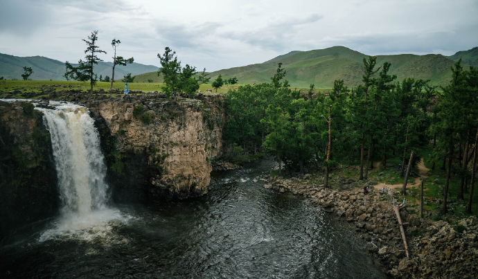 沿着 Orkhon gol 鄂尔浑河的支流 Tuul gol 我们来到了Orkhon Khurkhree 鄂尔浑瀑布。Ulaan Gol 在经过这 25 米高的瀑布之后汇入了鄂尔浑河,该瀑布的震撼程度绝对在我的意料之外。广袤的草原上我们看见了遍地的牦牛群与羊,就是看不见这瀑布,却能听见它从几百米开外传来的轰隆声。循着声响跟过去才发现深陷地底的一处大窟窿便是瀑布所在。我们几人找到了 一个小径经过将近半个小时的手脚并用的攀爬才下到了瀑布旁边。看到这汹涌的瀑布让人心中生畏,害怕这巨响,敬畏这自然。