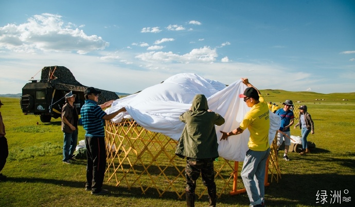 第二天行程的最后一项工作就是搭建蒙古包营地;我们从“大宝贝”上卸下搭建蒙古包的工具,为大宝贝搭起遮阳棚,这是我们等下吃晚餐的地方,同行的小姐姐们也忙碌起来,开始为我们准备丰盛的美食;