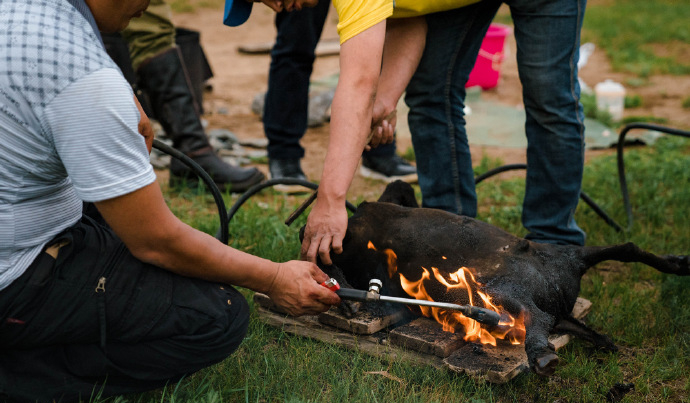 接下来就是传统蒙古美味石头羊登场了,石头羊采用高压锅烹饪的原理,把烧过的鹅卵石放在羊肚内,一层石头一层肉,一层石头一层洋葱和土豆,用铜丝扎紧羊口,使羊肚形成密闭空间,然后继续用煤气喷枪加热外部。当然做起来并没有我三言两语说得那么简单,需要极其熟练的手法与技巧才能做出一个看似成功的bvvdg;