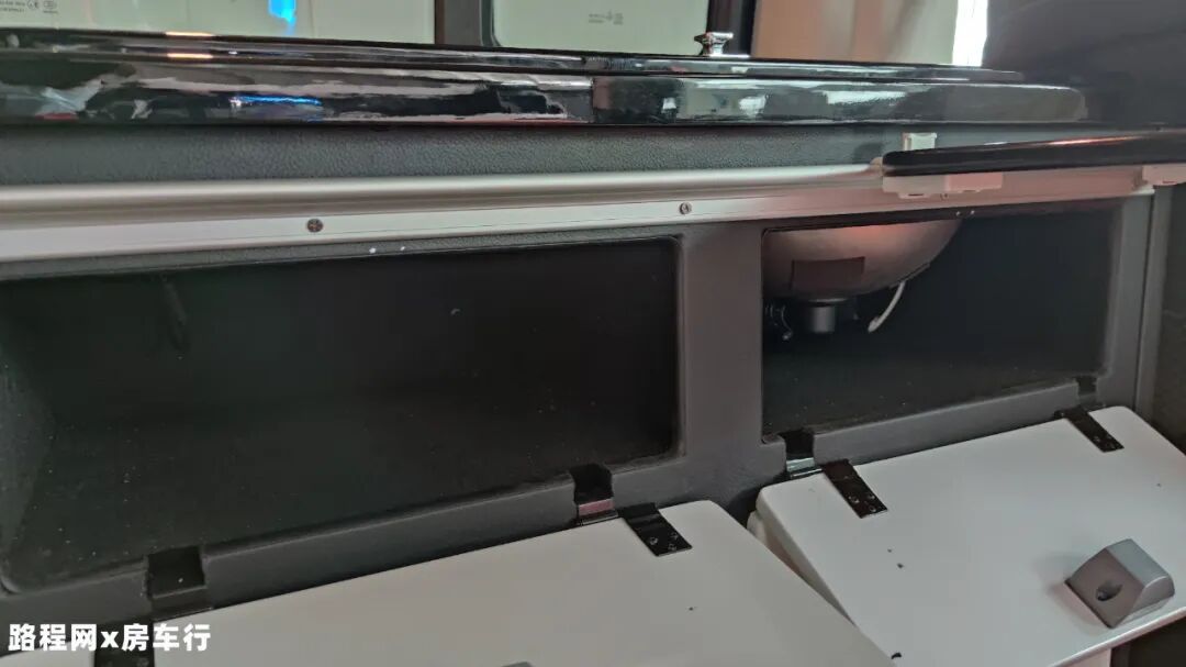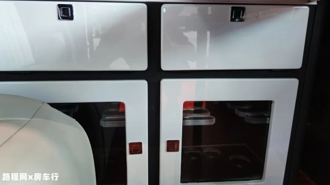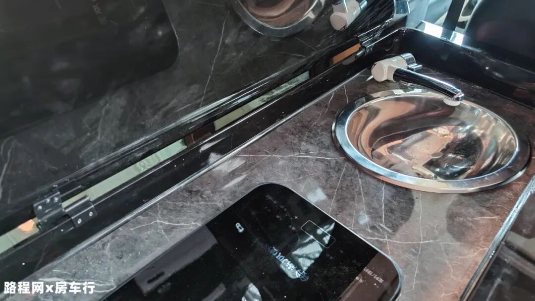 商务座椅侧面是简易厨房,采用整体式橱柜的设计,打开上方盖板后,可以看到内部设有洗水槽、抽拉式水龙头、800W车载电磁炉等设施,可以进行一些简单的食物烹饪;电磁炉的下方设有储物格,方便收纳一些厨房物品。