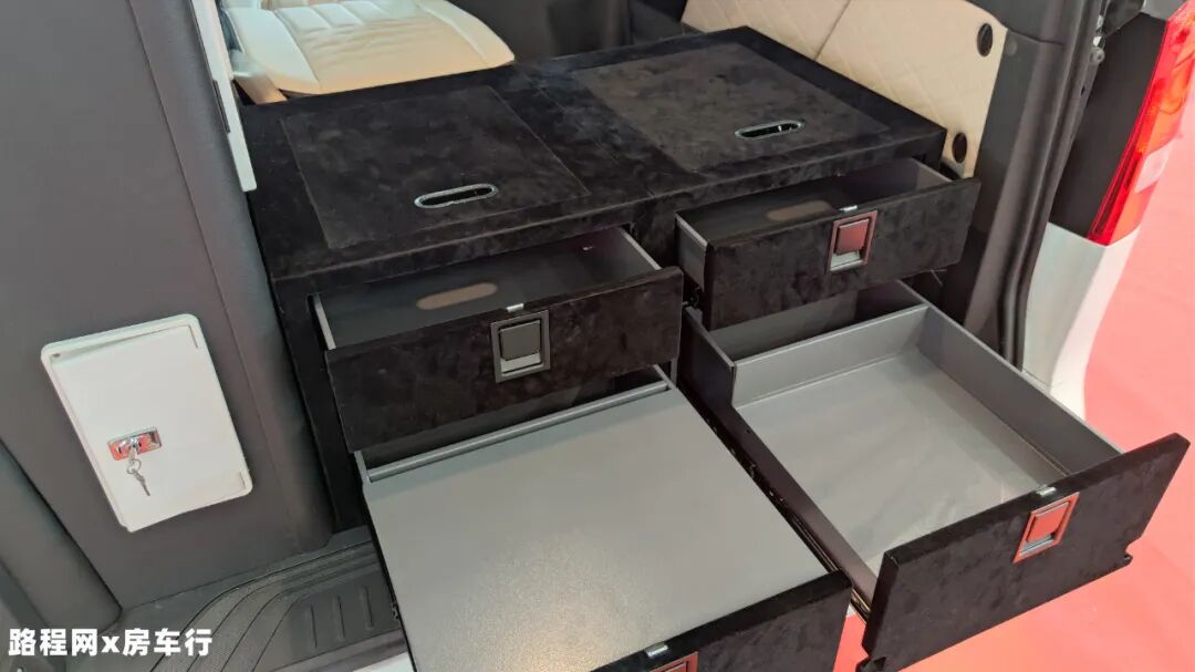 尾门后方是是4个抽拉式储物抽屉,可以收纳一些常用的户外物品;抽屉都设置了按压式锁扣,防止行车时因为车身晃动打开;储物抽屉左侧是淋浴花洒,解决户外洗浴问题,另外还有户外充电口补充电力。