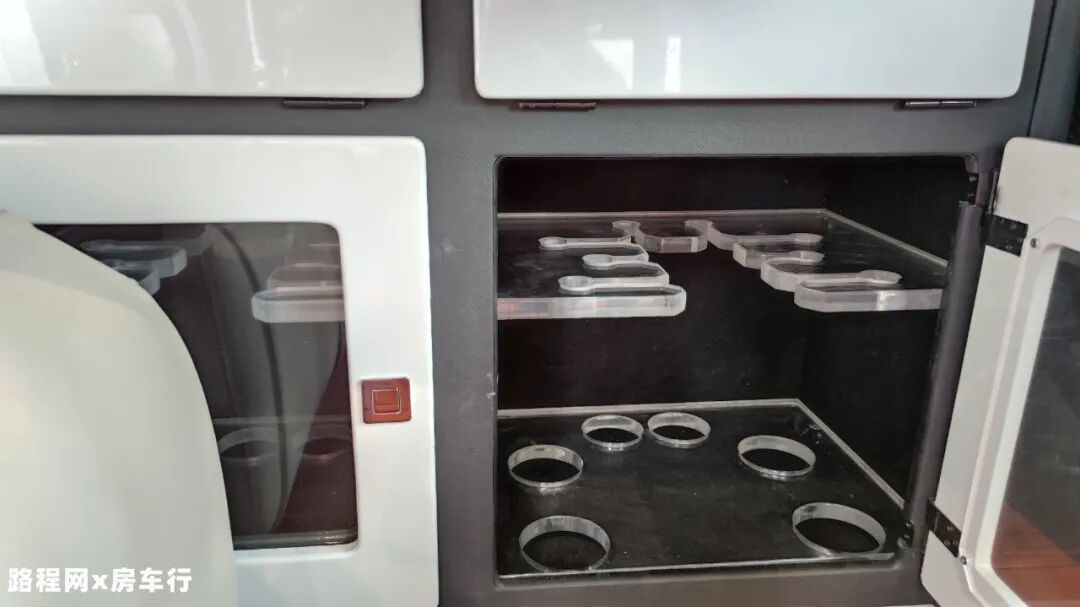 左侧是一台车载冰箱,尺寸虽然小了一些,但冷冻、冷藏功能配备齐全,用于保存旅行烹饪所需的食材;侧面是整车的水电灯光控制系统,可实时调控全车水电灯光和电器。