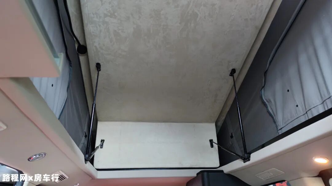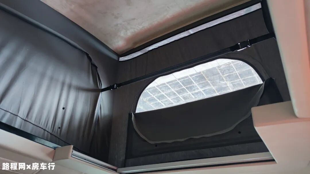 顶部升顶床设置在会客厅上方,驻车后可以打开,降下床板后形成一张空间宽敞的床铺,满足日常睡眠休息所需;床铺侧面设有拉链窗,保障睡眠空间的采光。