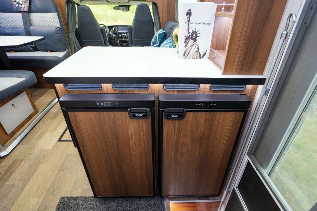 操作台下方是152L英德尔车载冰箱,采用分体式设计,具备冷藏、冷冻的使用功能,旅行时可以存放食材。