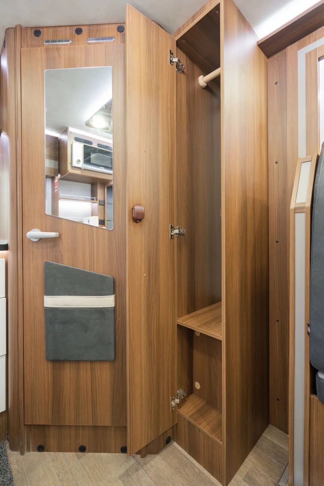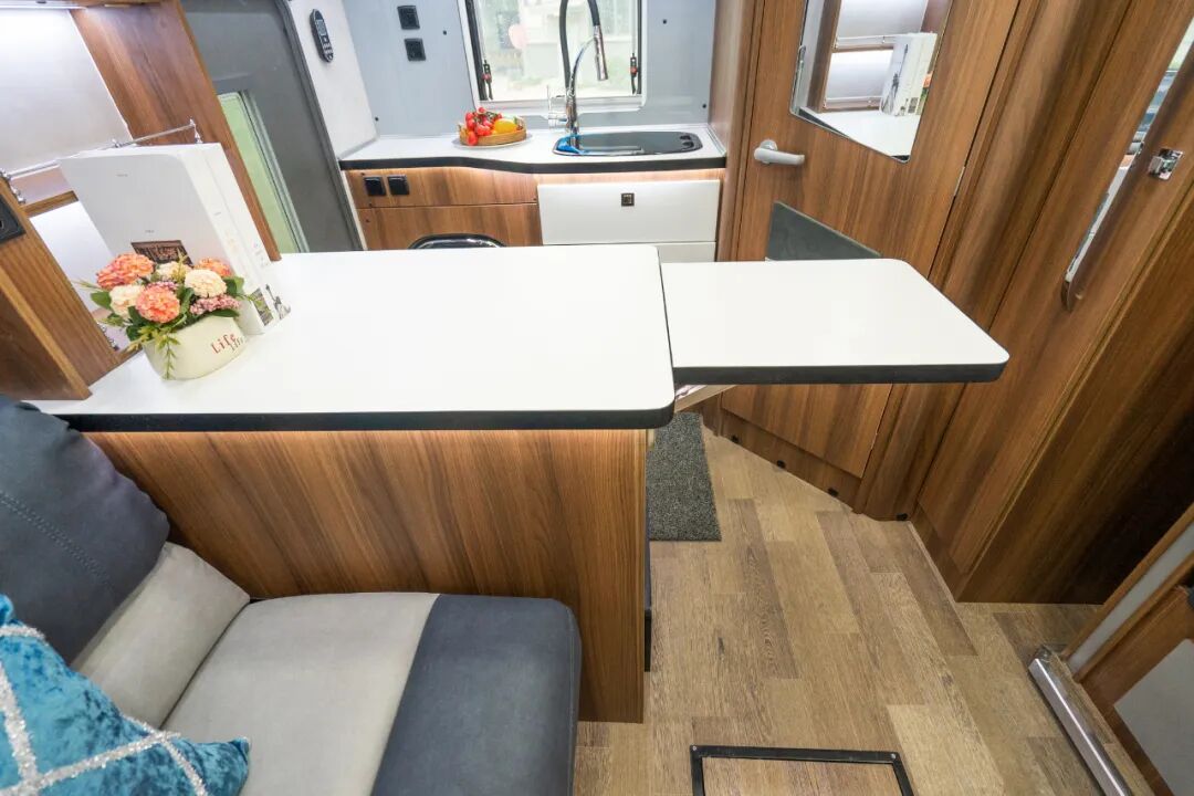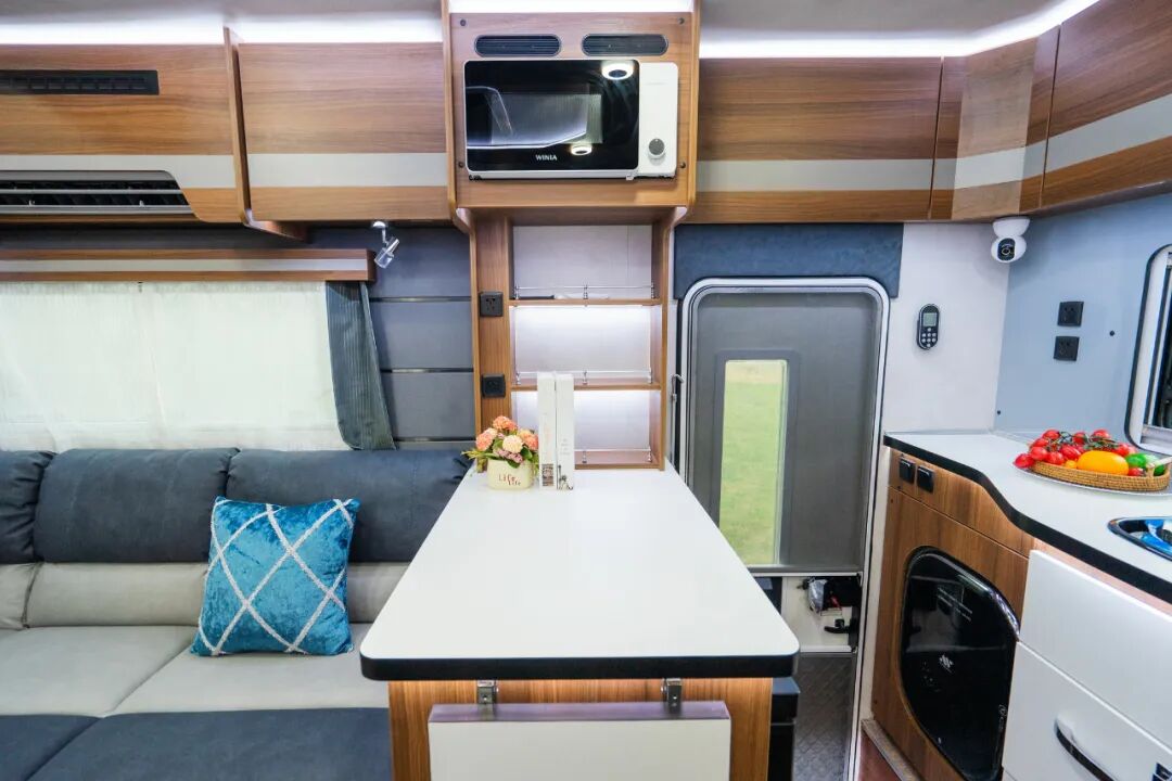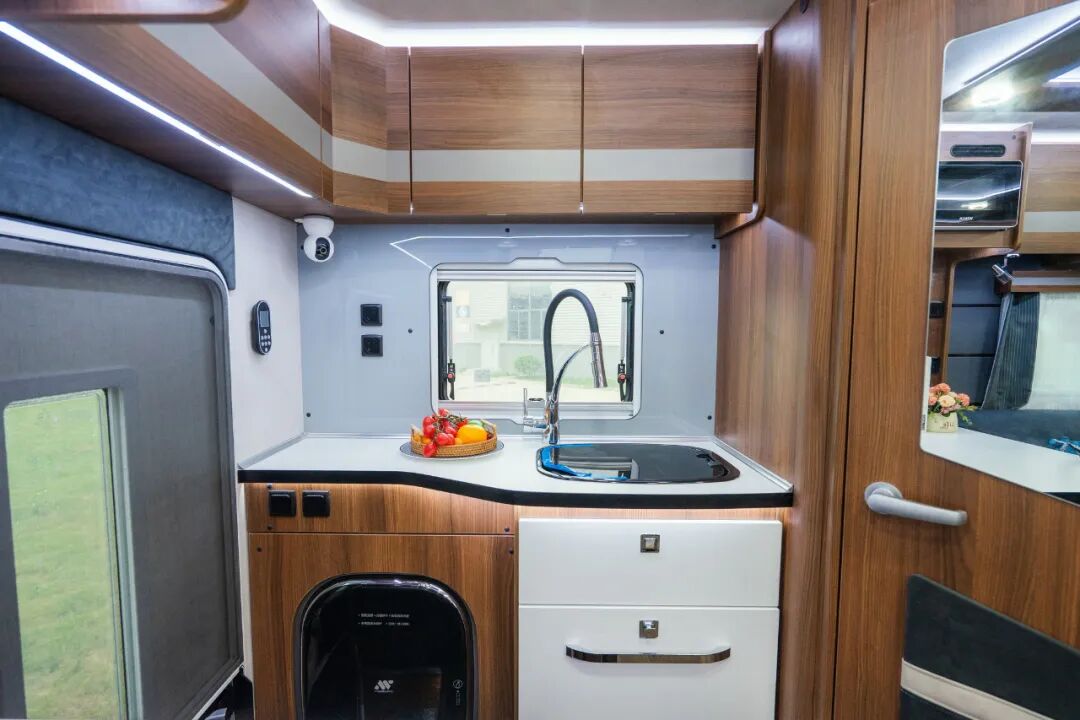厨房区设置在车尾紧邻乘客门的位置,采用整体式橱柜设计,内部配备多功能洗菜池、可移动水龙头、电源插座等,下方还有一台3KG莫博洗烘一体机,右侧是储物抽屉,用于收纳厨房物品,顶部还设置了储物吊柜。