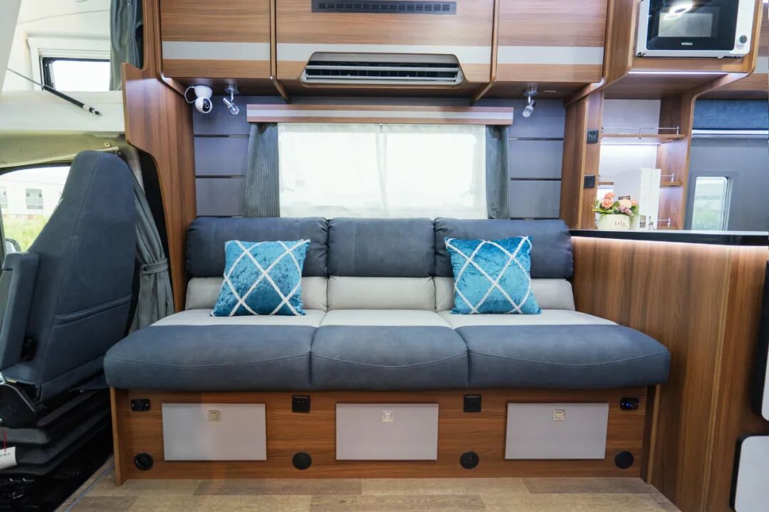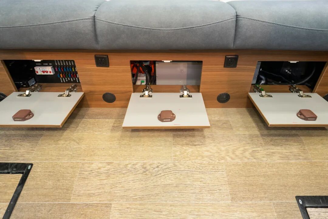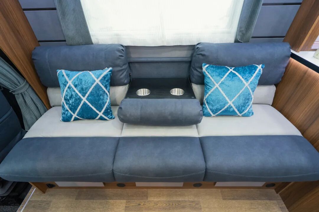 沙发中间设有隐藏式桌台,放下靠背就可以使用,桌台设置了杯槽方便放置水杯;沙发下方设置了水电控制开关,可以控制全车水电。
