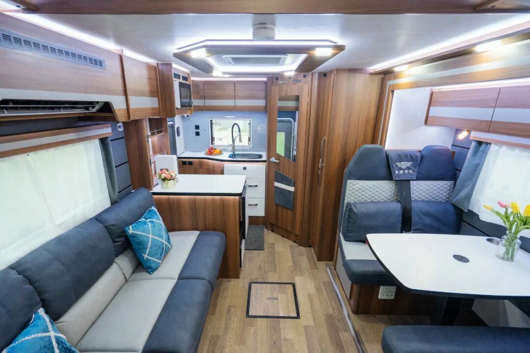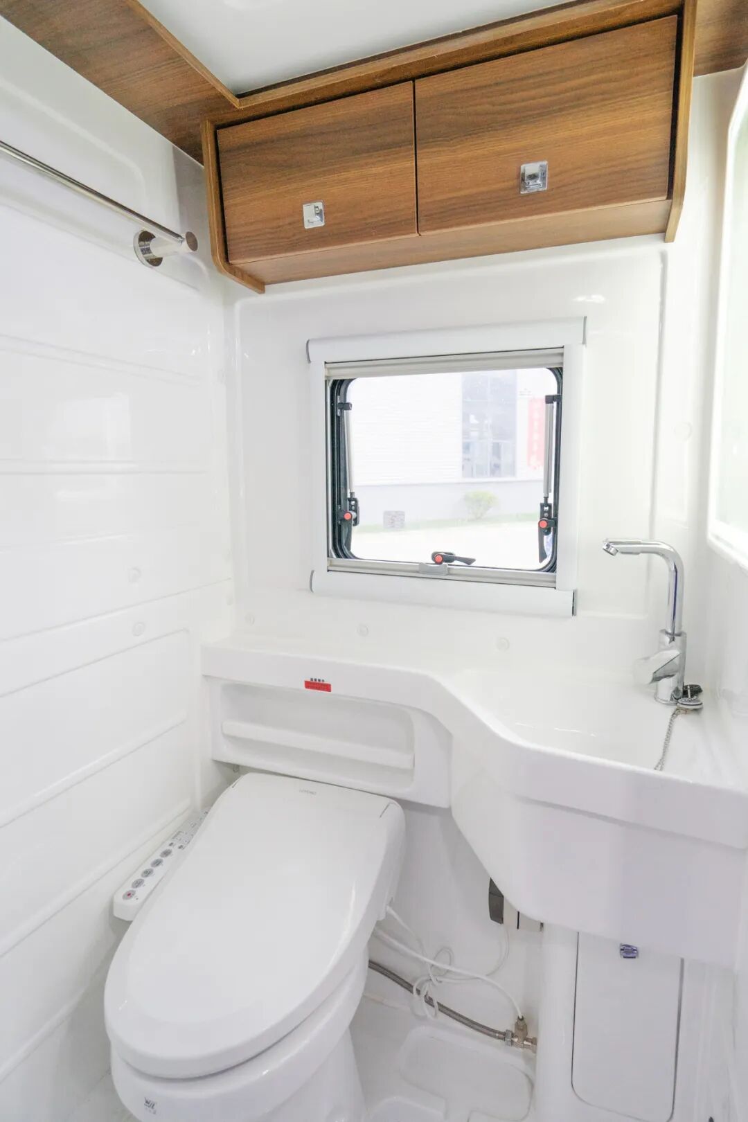车内生活区采用尾置厨卫布局,空间感更强,生活也更舒适;内饰采用木质家具搭配深色软装,打造温馨舒适的生活空间,地面铺设环保PVC地板革,绿色健康,环保无异味;车内还配备暖风系统、热水系统,让旅居生活更舒适。