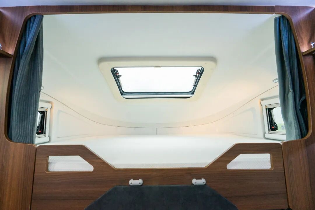额头休息区是一张大尺寸双人床,睡眠空间宽敞舒适,床面铺设慢回弹海绵床垫,睡眠体验更佳,侧面设有房车专用蹬床梯方便上下;采光通风设置了天窗、侧车窗,保证睡眠空间采光。