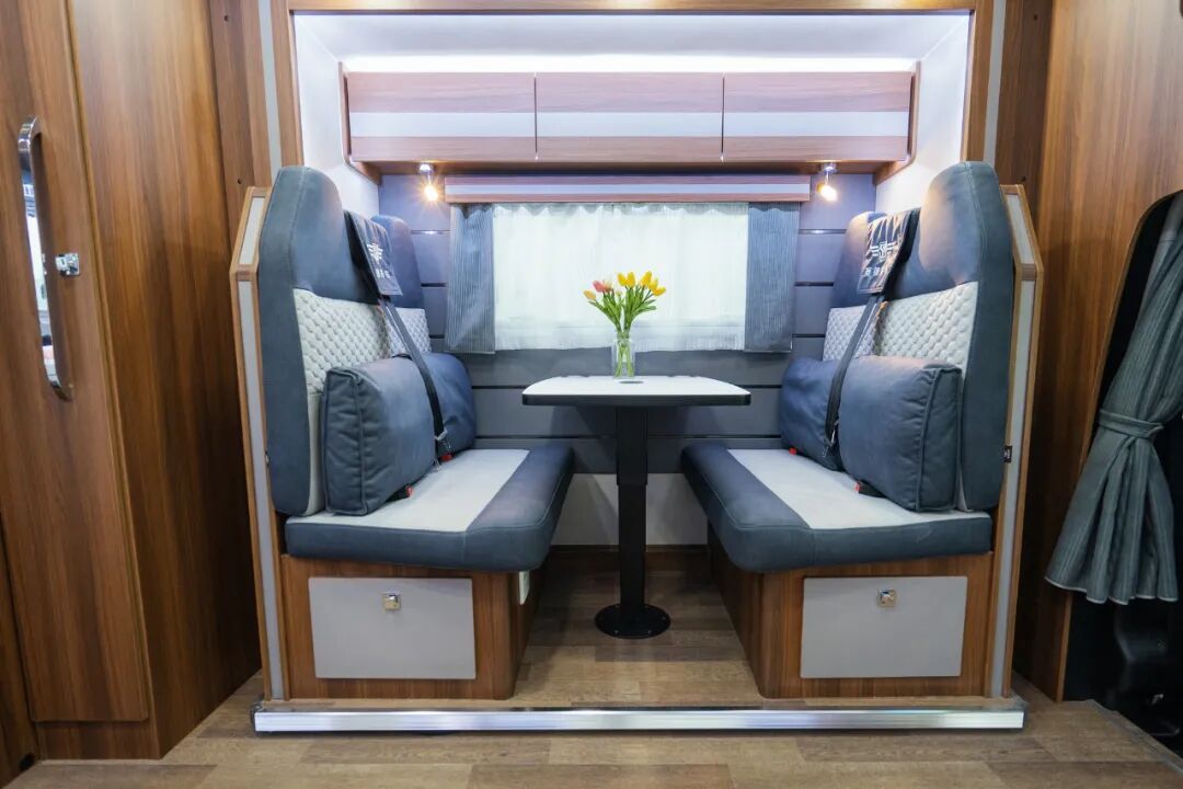 对向沙发卡座设计的会客区位于拓展舱内,拓展后内部空间更宽敞;对向卡座均设有三点式安全带,保证行车时乘坐安全;中间是一张升降餐桌,满足日常就餐、办公需求,休息时可以拼床,储物方面设有储物吊柜。