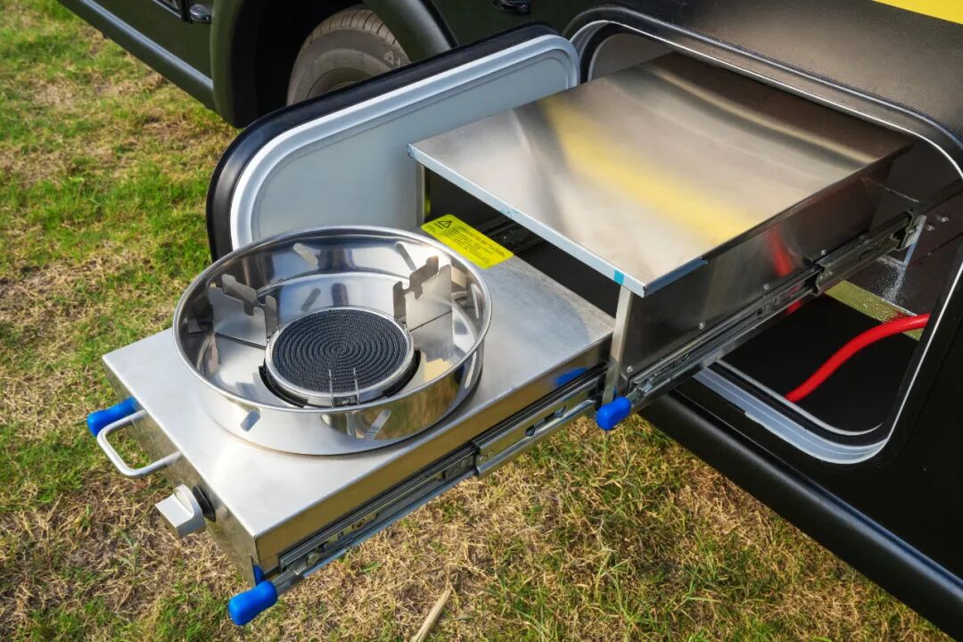 车身右侧设置了多功能抽拉式灶台,方便喜爱烹饪的车友在户外展露厨艺,灶台侧面还配有折叠桌板,烹饪时可以放置食材或调味品。