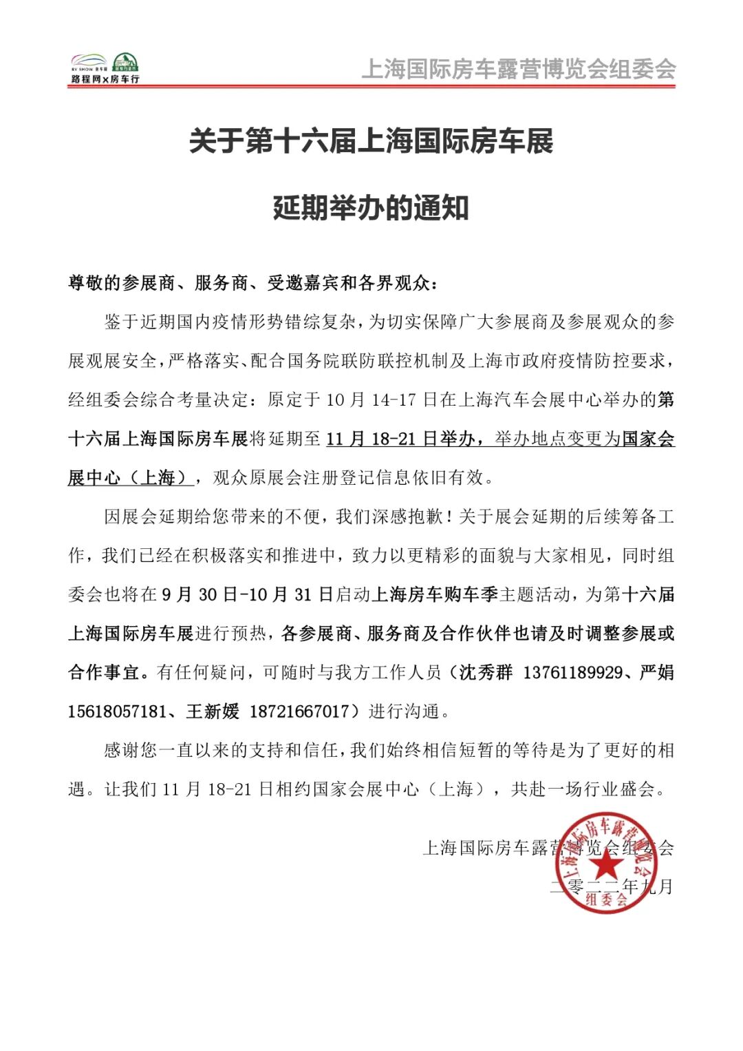 鉴于近期国内疫情形势错综复杂,为切实保障广大参展商及参展观众的参展观展安全,严格落实、配合国务院联防联控机制及上海市政府疫情防控要求,经组委会综合考量决定:原定于10月14-17日在上海汽车会展中心举办的第十六届上海国际房车展将延期至11月18-21日举办,举办地点变更为国家会展中心(上海),观众原展会注册登记信息依旧有效。