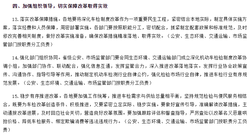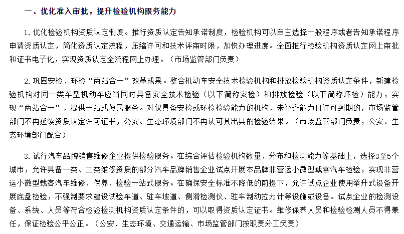 此部分优化内容主要有:检测机构资质认定制度,简化流程、加快办理进度,并推出网上办理业务;整合机动车安全技术检验机构和排放检验机构资质认定条件,推行巩固安检、环检“两站合一”;允许部分汽车品牌企业试点开展本品牌非营运小微型载客汽车检验服务。