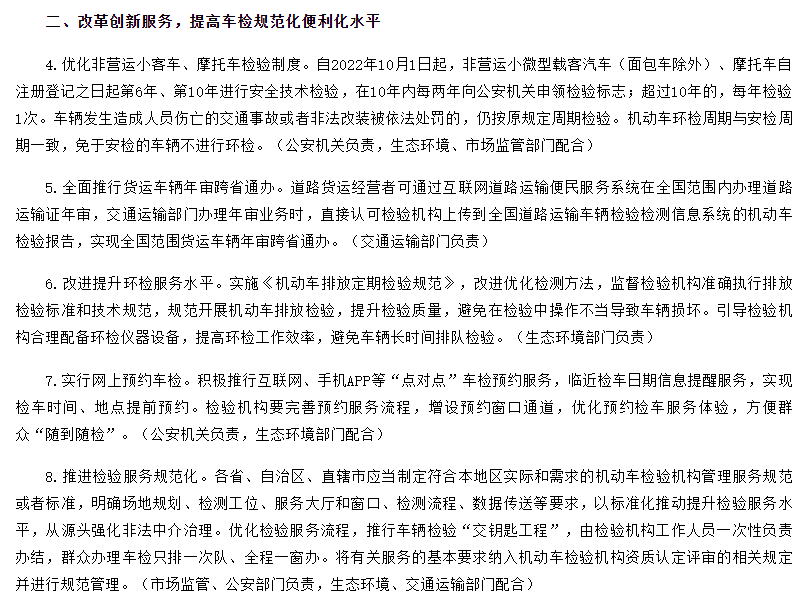 此部分内容主要有:10月1日起,非营运小微型载客汽车(原10年内检测三次,超过15年每半年检验一次;面包车除外)、摩托车(原10年检测五次)统一调整为10年内检验两次,超过10年每年检验一次;推行全国范围内货运车辆年审跨省通办;推进检验服务规范化,实行网上车检预约服务,提升环险服务水平,提高环检工作效率,避免“暴力”检验。