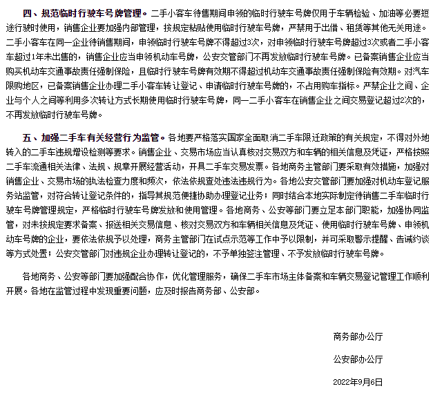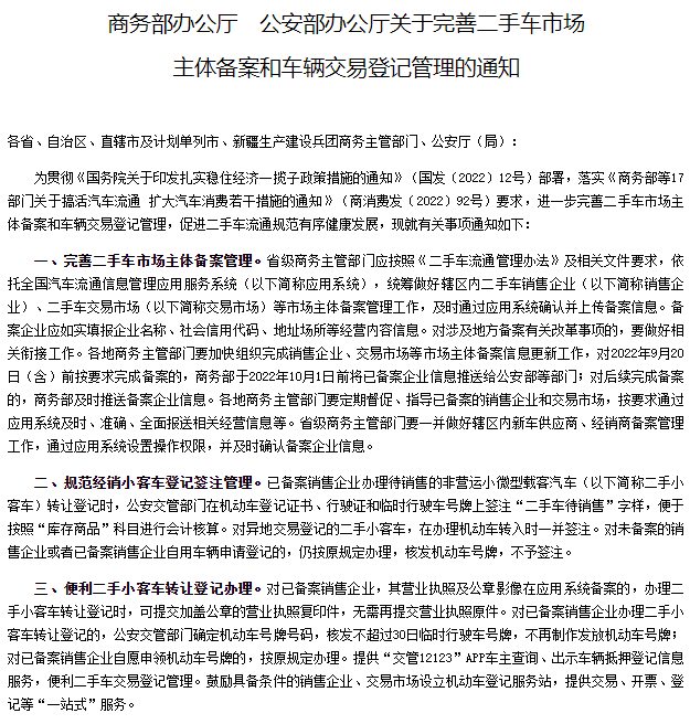 为规范二手车交易,促进二手车流通规范有序健康发展,商务部、公安部办公厅于近日发布了关于完善二手车市场主体备案和车辆交易登记管理的通知,通知对二手车销售企业、二手车交易市场等市场主体及二手车经营、销售、转让、登记等内容均提出明确的规范、规定。