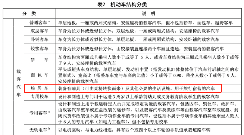争议主要来自以下两点,一是按照汽车行业标准-QC/T 776-2017旅居车标准文件显示,旅居车按照车辆长度进行分类,车身长度小于6米且核载人数不超过6人的归为小型旅居车,车身长度大于等于6米则归为大型旅居车;