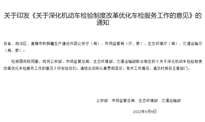 近年来,随着汽车工业发展和技术进步,汽车产品质量不断提升,私家车车主车辆保养意识也不断提高,社会各界普遍呼吁放宽私家车检验周期。为积极回应群众期待,适应汽车产业发展、交通安全和大气污染防控形势,9月15日,公安部、市场监管总局、生态环境部、交通运输部四部门发布深化车检改革新措施,推出了优化私家车检验周期、推进网上预约检验等一系列便民利民措施。