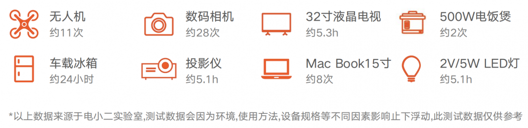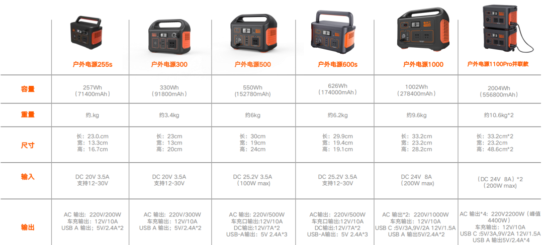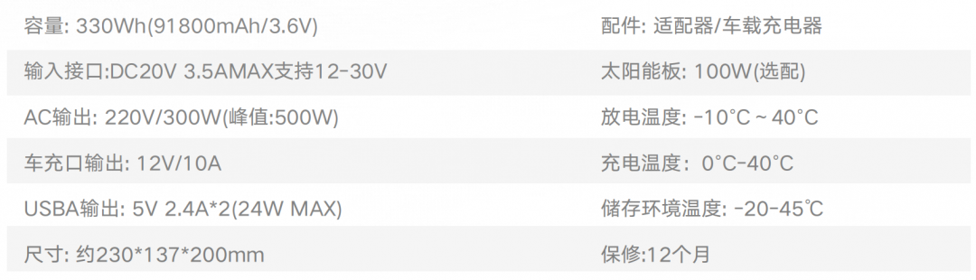 容量330Wh(91800mAh),300W高功率正弦波AC输出,持续功率 300,W,峰值可达500W,可匹配各类车载设备数码设备、小家电等、 类似车载冰箱、无人机、游戏本、摄像机、手持云台等;常用于短途旅行、露营、户外摄影、直播等场景。