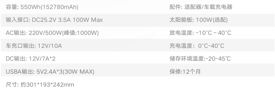 容量550Wh(152780mAh),自驾旅行必备电源。500W高功率 正弦波AC输出,持续功率500W,峰值可达1000W。内置车充 口12V输出;适用于自驾旅行、露营、户外小型音乐派对、家庭 应急用电、特殊户外工作等场景。
