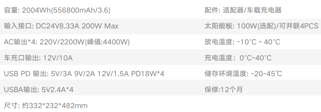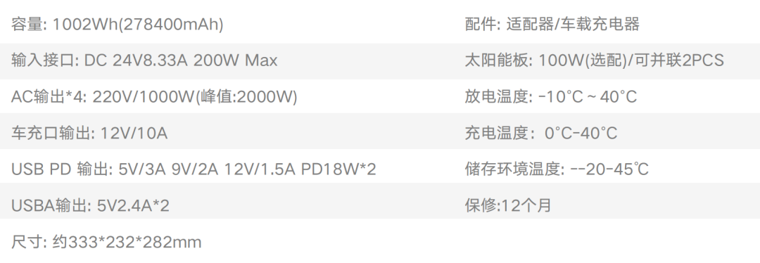 容量1002Wh(278400mAh),内置220VAC输出,持续功率1000W, 峰值可达2000W,内置车充口12V及USB 5V输出。可匹配呼吸机、 移动测温门、消毒机、电钻、小型家电、无人机摄影等设备;适用 于长途自驾、应急救援、地质勘测、汽车补电等场景。