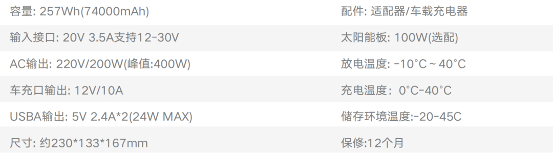 容量257Wh(71400mAh),220V AC输出,,持续功率200W, 峰值可达400W。兼容各类车载设备、无人机、游戏本、摄像 机、手持云台等,适用于短途自驾旅行、露营、户外摄影及家 庭应急等场景。