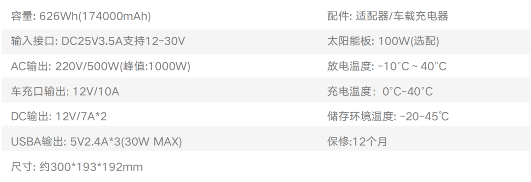 容量626Wh(174000mAh),内置220VAC输出,持续功率500W, 峰值可达1000W,内置车充口12V及USB5V输出。可折叠提手, 收放自如,方便收纳;可匹配各类车载设备、数码设备、小家电, 常用于自驾旅行、露营、摄影及家庭应急用电等场景。
