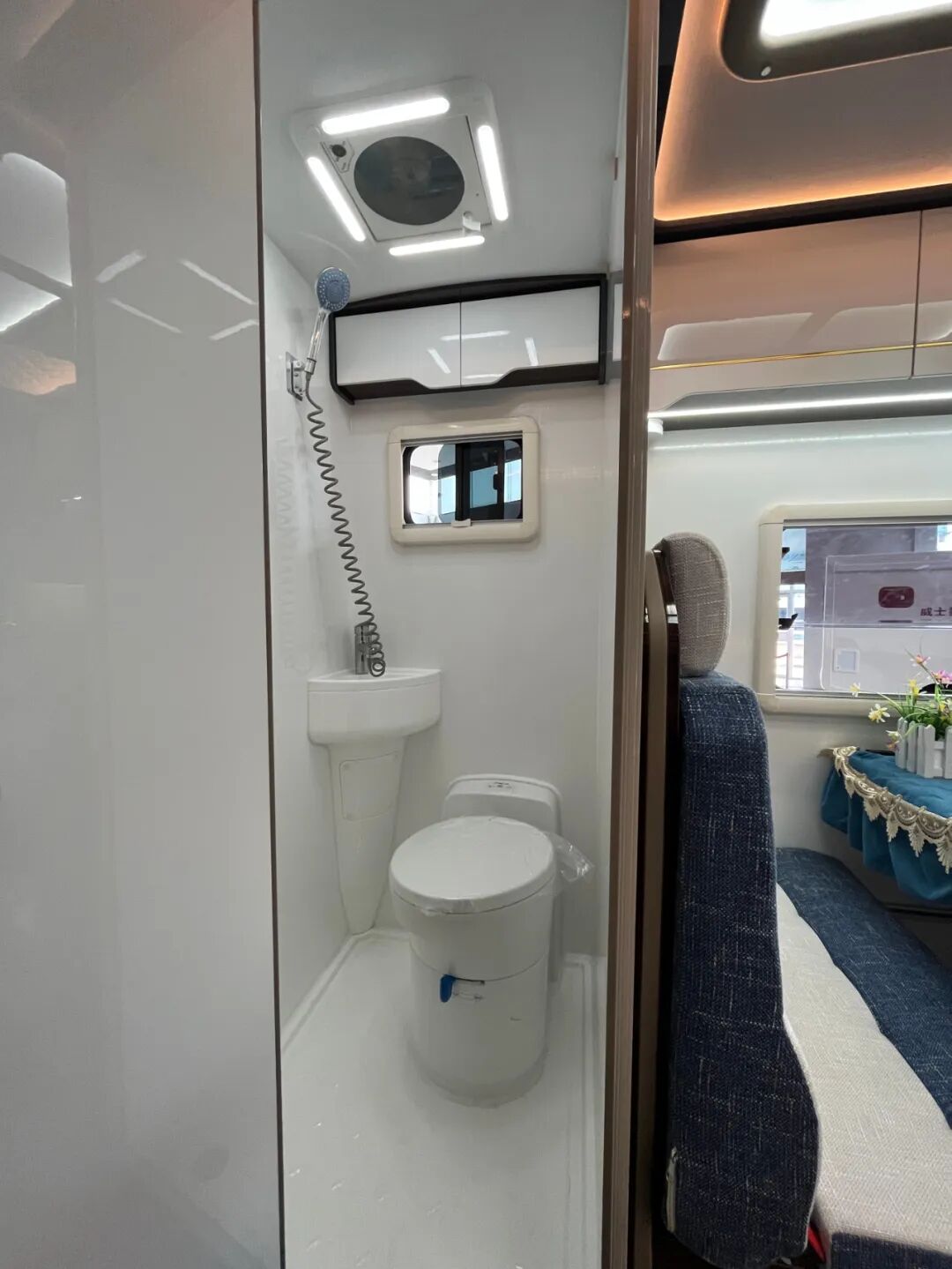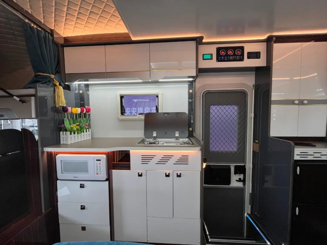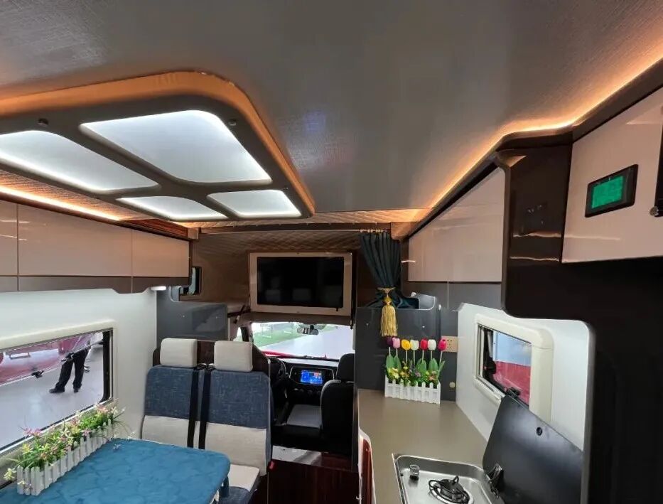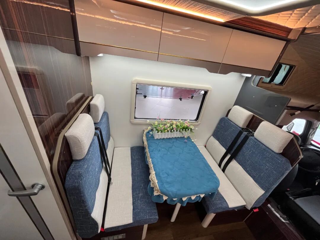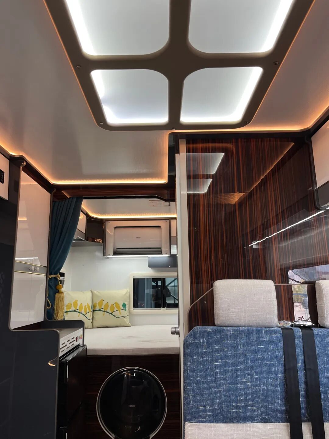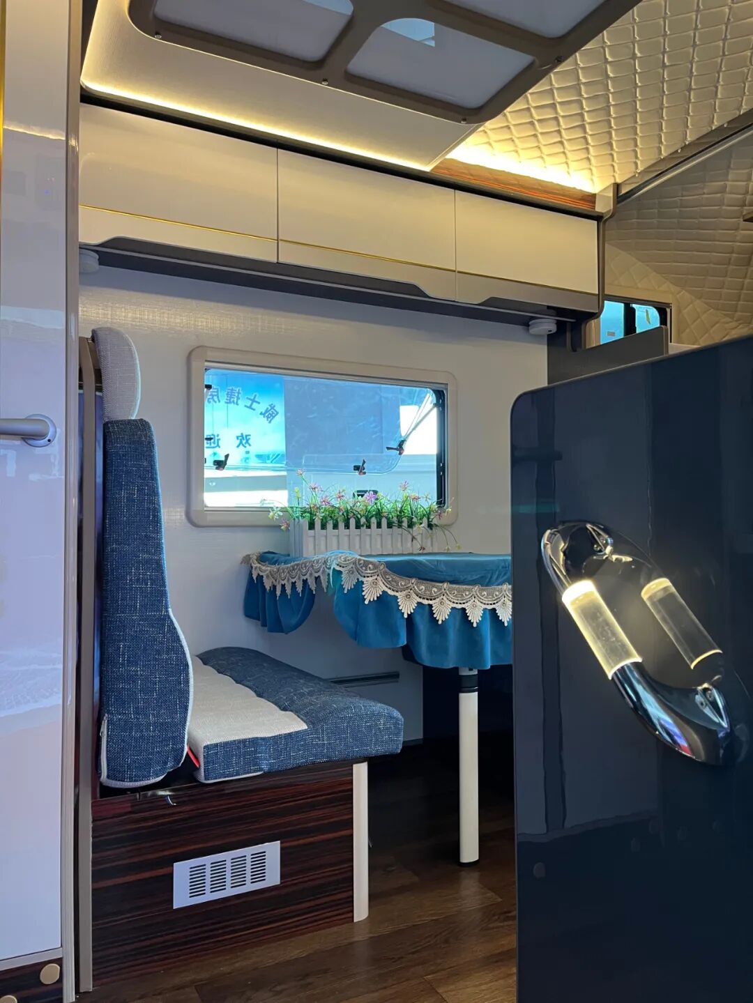车辆内饰采用高级环保轻质板材,整体配色高端、大气,彰显奢华,达到国内一线房车内饰标准要求。