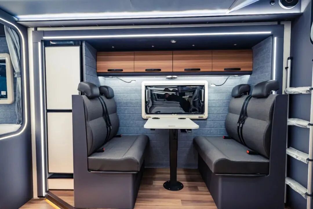 车内空间是C型房车常见尾横床布局,空间利用率高效,居住也更舒适,休息空间设有额头床+卡座拼床+尾横床,睡眠空间丰富;会客厅位于侧拓展舱内,设有对向沙发卡座,满足日常娱乐、就餐需求。