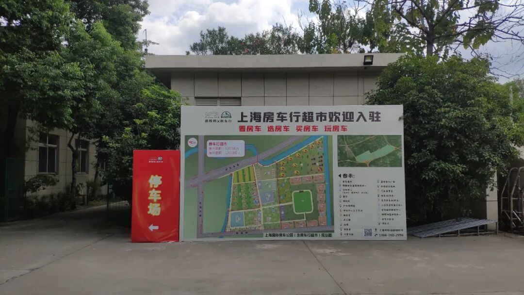 园区进门处,房车行超市(上海)平面图及停车指引桁架均已摆放到位......