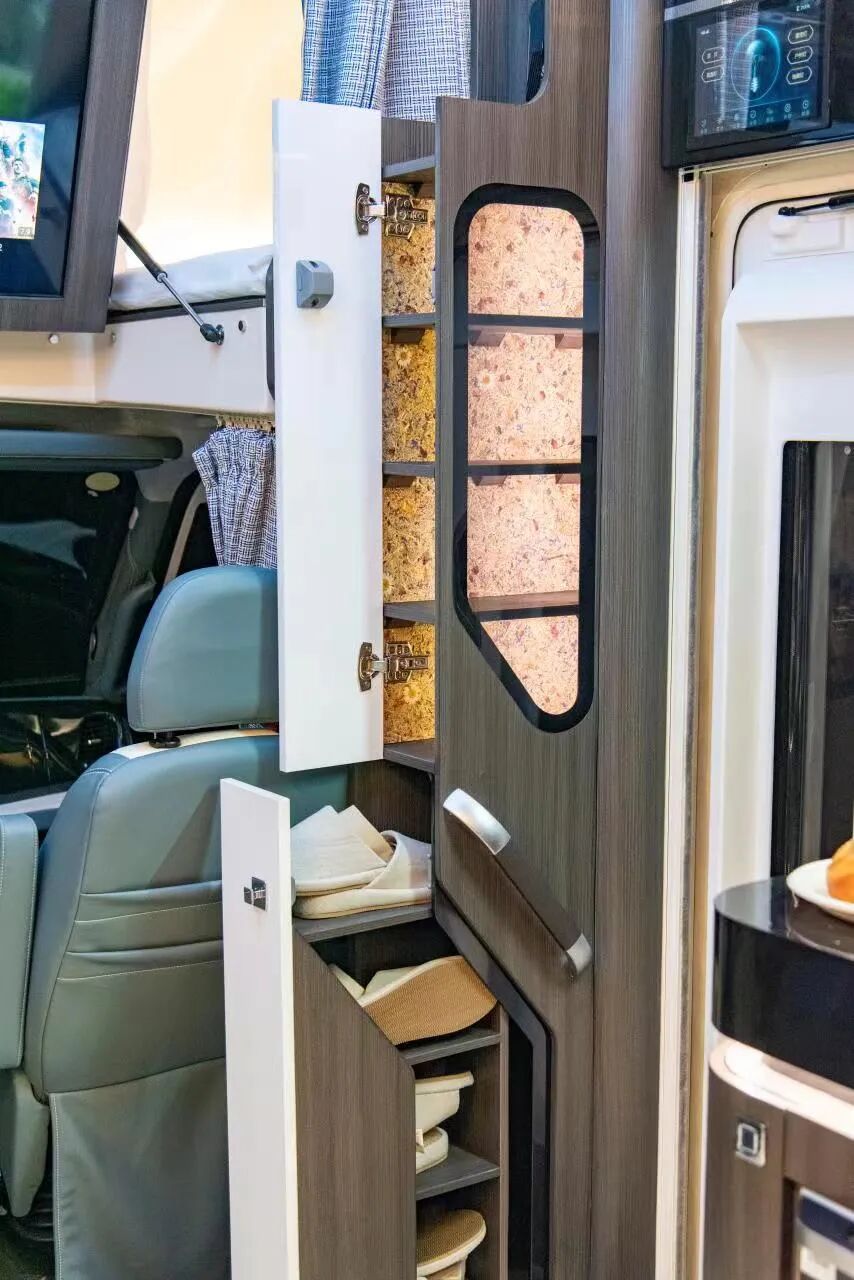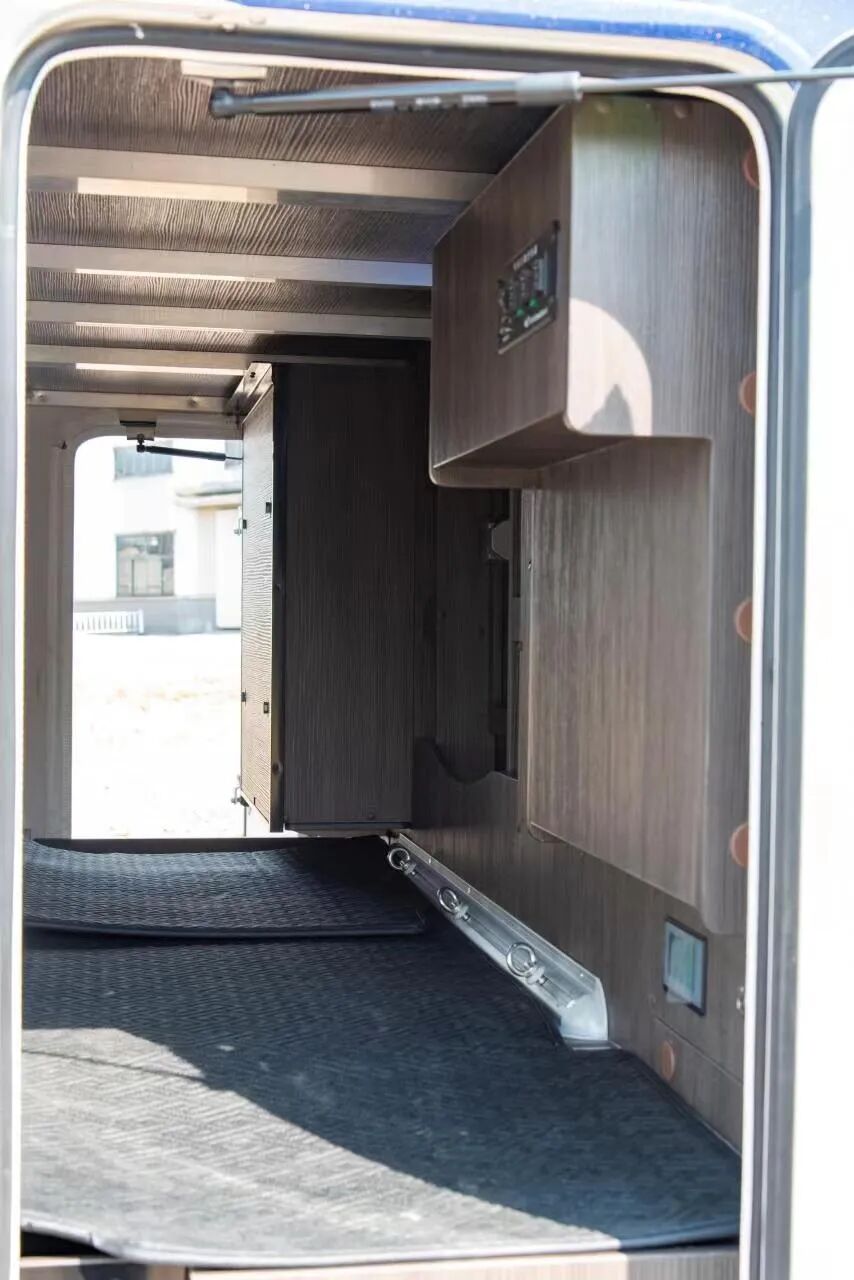 车尾设置了贯通式超大行李舱,储物空间充足,内侧设置了电动支腿控制开关,驻车支撑更轻松;行李舱和内部生活区贯通,打开隔门后可以直接从车内拿取物品。