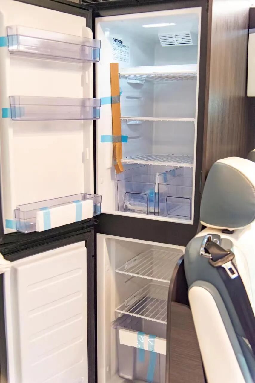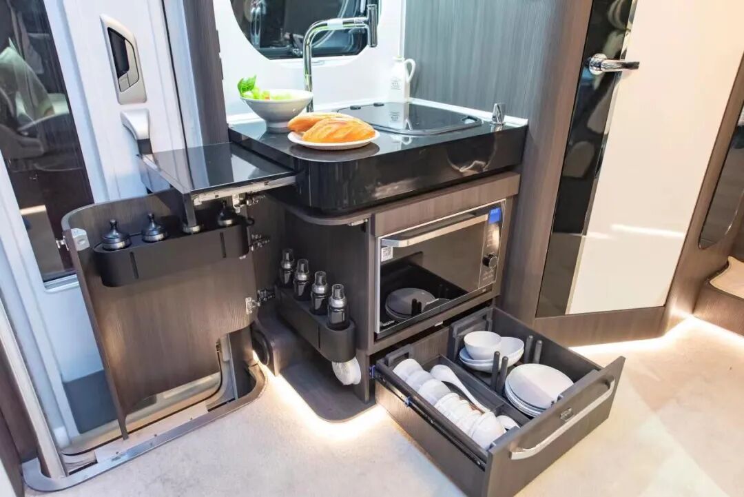 会客区设置在侧拓展舱内,内部是常见的对向沙发卡座设计,可满足多人乘坐需求,行车时也可以乘坐;中间是进口可调节升降餐桌,休息时调低后可以拼床;后方是一台进口双开门房车专用冰箱(86.5L冷藏+55L独立冷冻),和厨房区搭配使用。