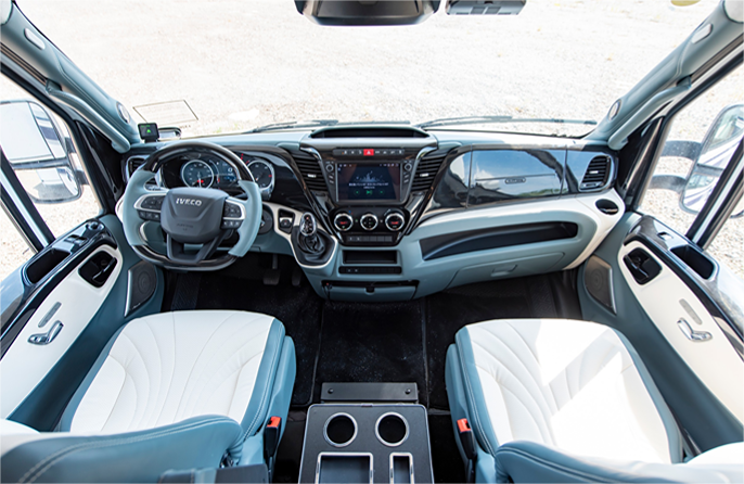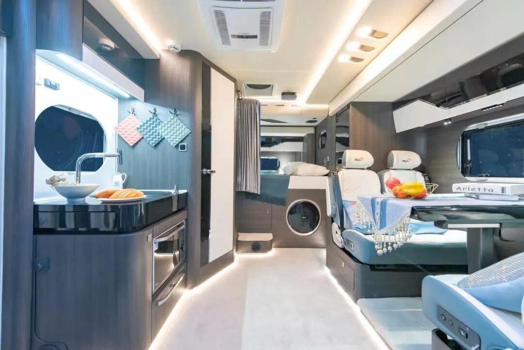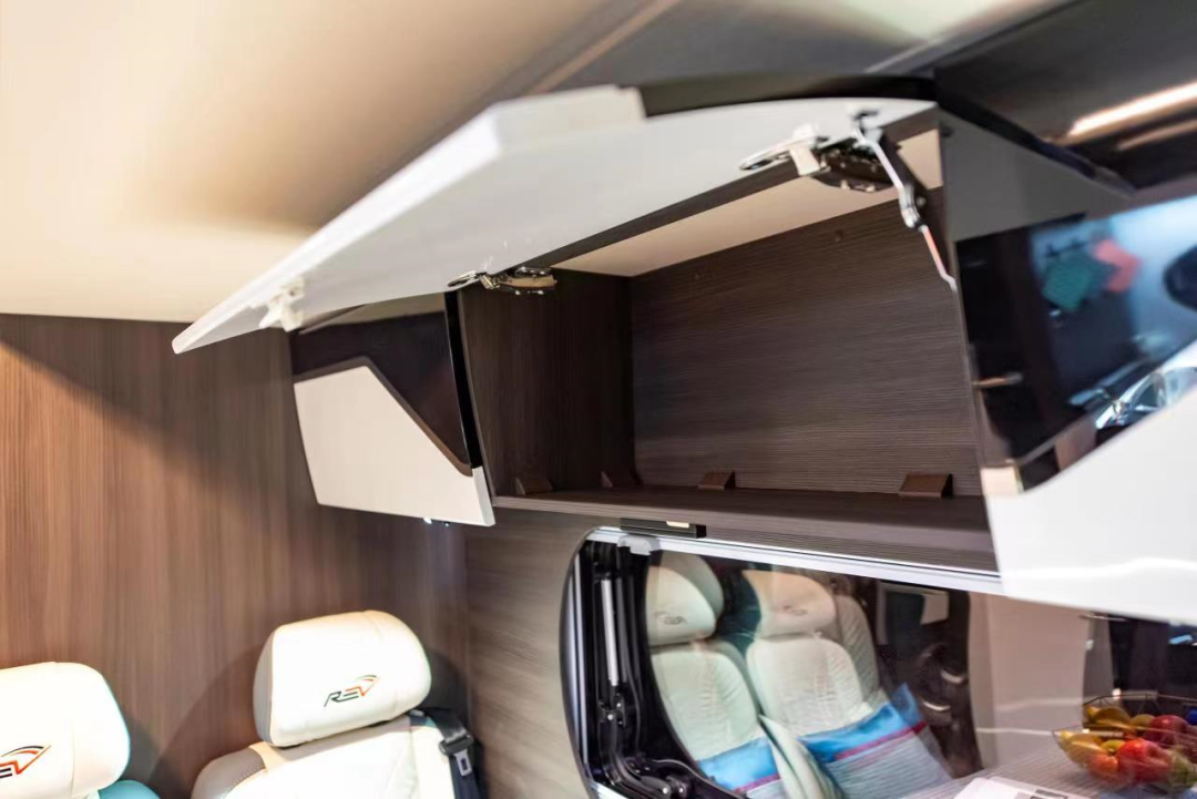 整车内饰采用进口E0级环保标准房车家具板材,地面铺设进口双层环保地板革,健康环保,高端大气,车内家具还使用进口高级花草压缩板装饰,尽显豪华高端的气息;顶部造型吊顶和多系统分级控制豪华灯具组合,让整个空间更具高级感。