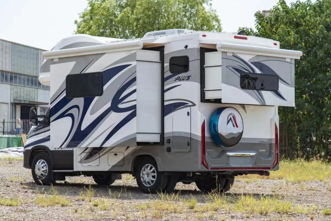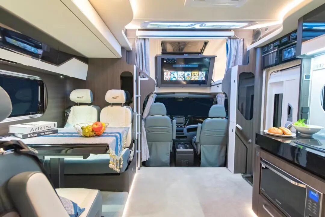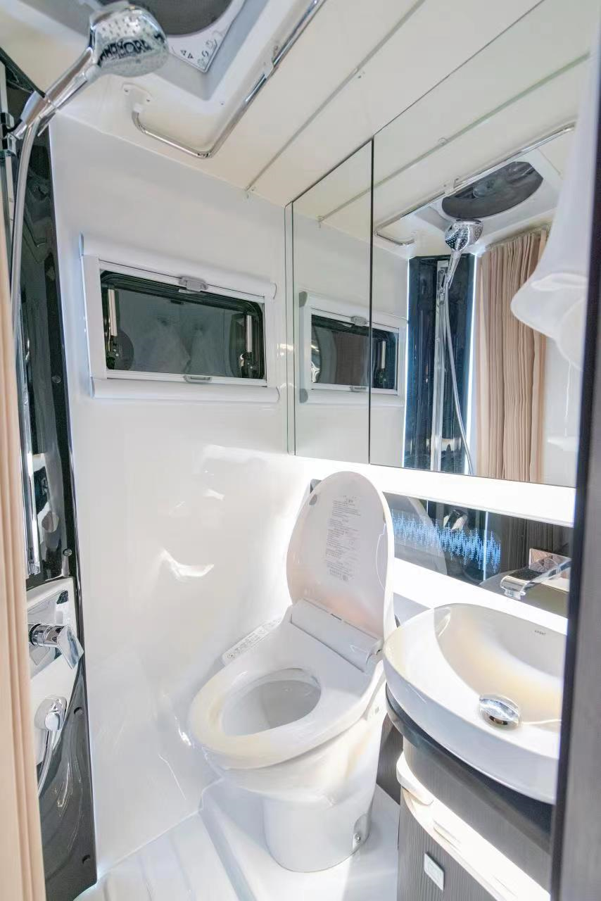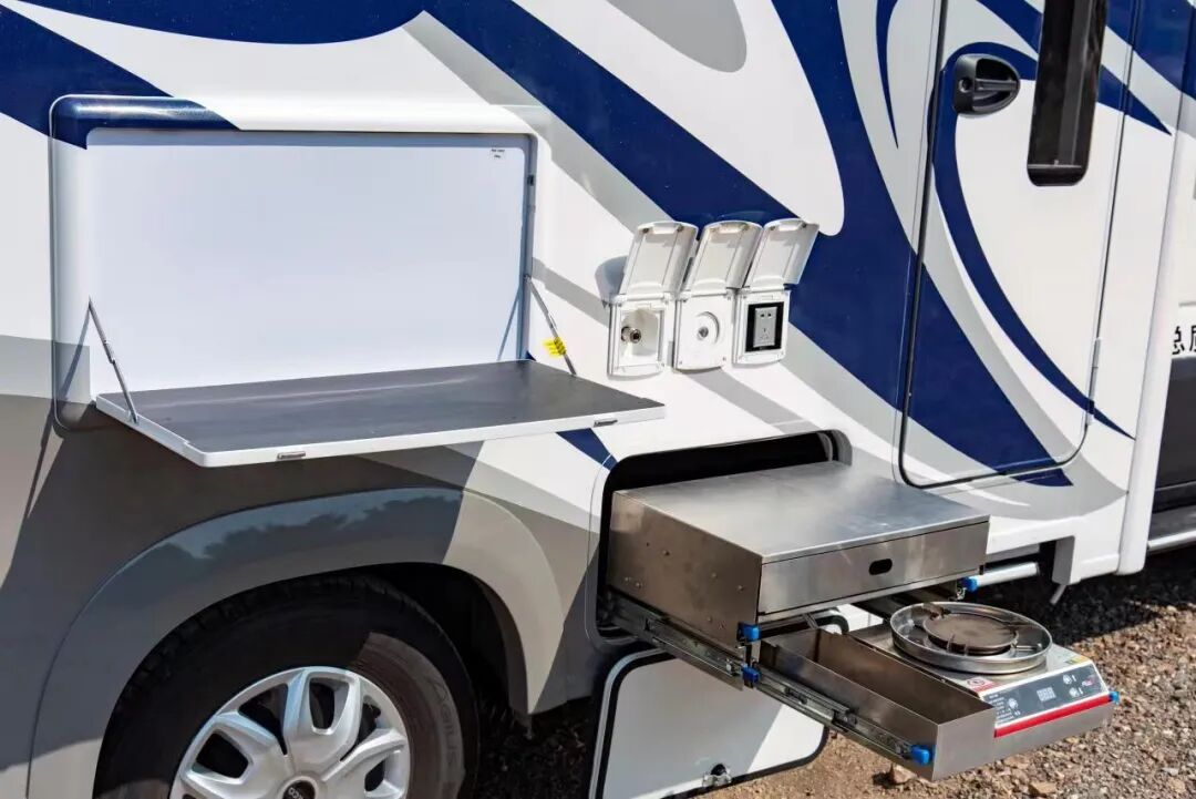 户外设施方面,整车配备了进口风感自动收回电动遮阳蓬、电动踏步、进口带中控乘客门、室外电源插座、重力/压力加水口、直流/交流外接充电口、移动线缆盘(带10m电源线)等。