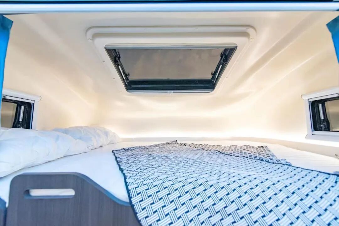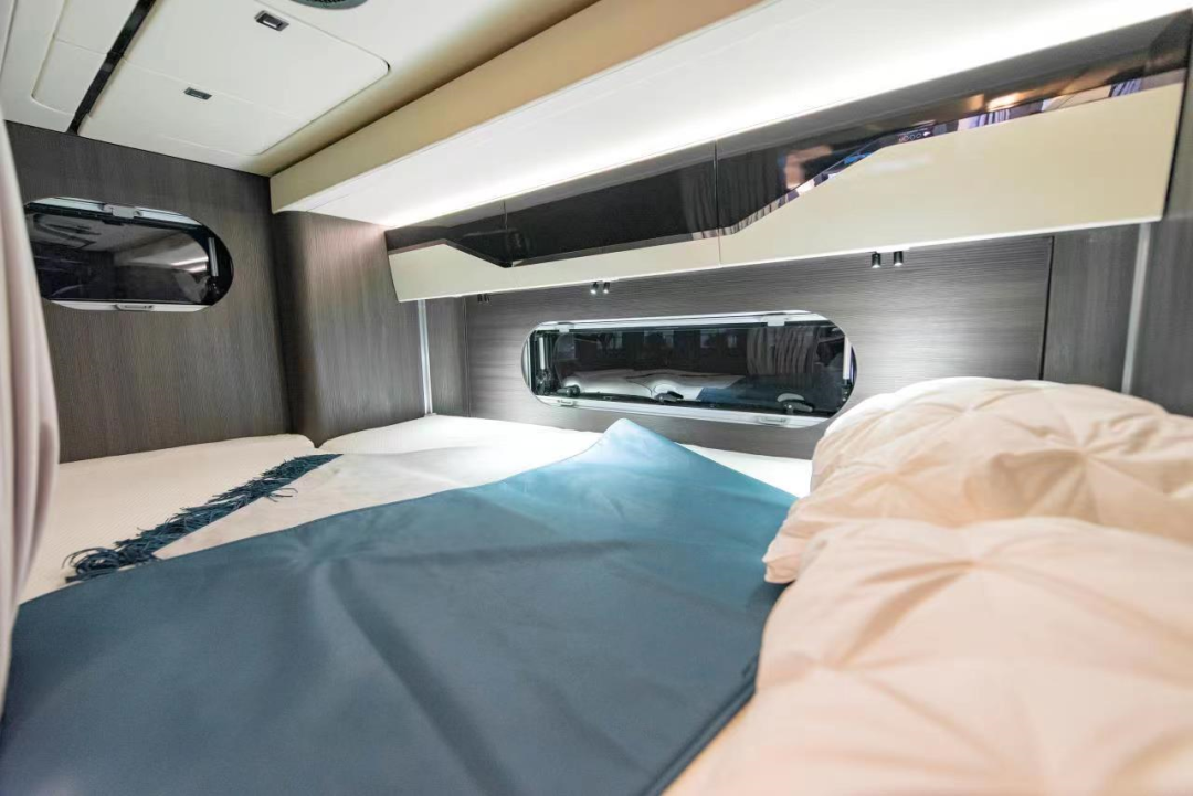 额头休息区双人床尺寸为2200x1400mm,睡眠空间充足,床面铺设5D保健床垫,舒适轻便,透气、抗菌、防霉性也非常不错;床铺顶部、两侧均设有车窗,顶部天窗打开后还可以欣赏户外风景。