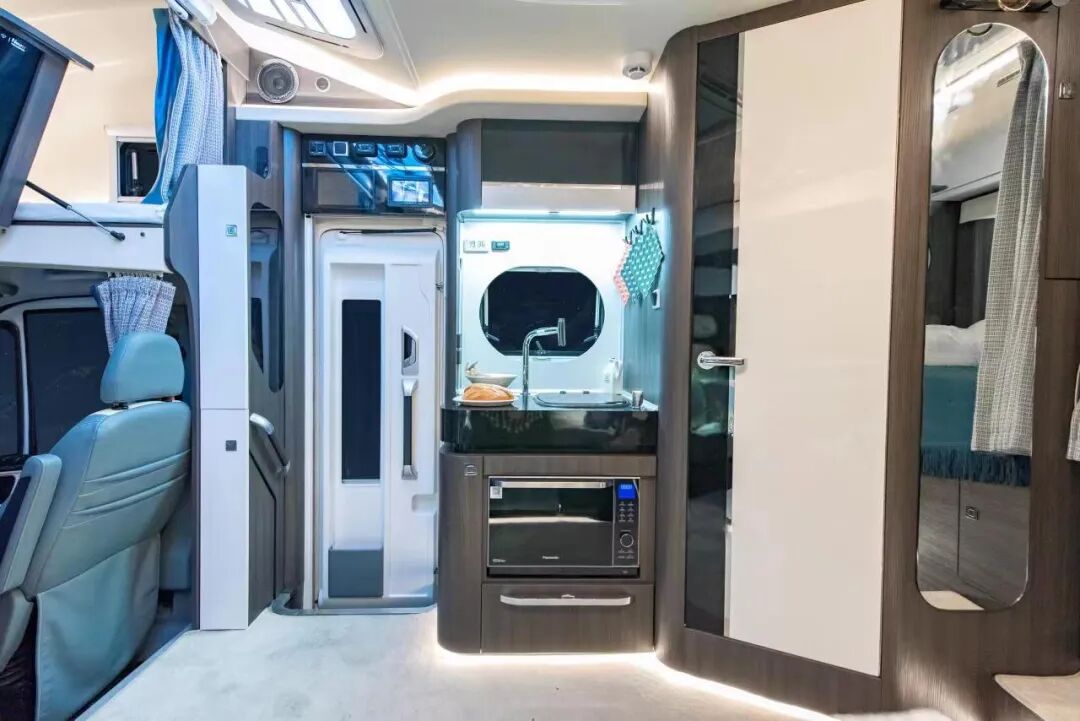 驾驶室后方是车内生活区,依次设置额头休息区、会客区、厨房区、卫浴区、尾部休息区,各项生活区功能配备齐全。