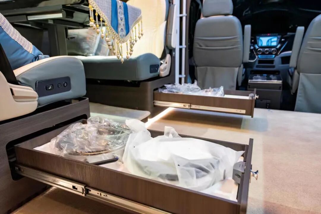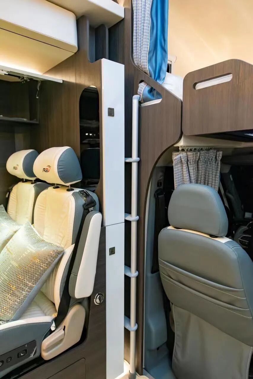 床铺左下方是额头床专用爬梯,抽出后就可以使用,可以轻松上下床铺;侧面还设置了按压式储物柜,充分利用车内空间,下方还专门设置了隐藏雨伞。
