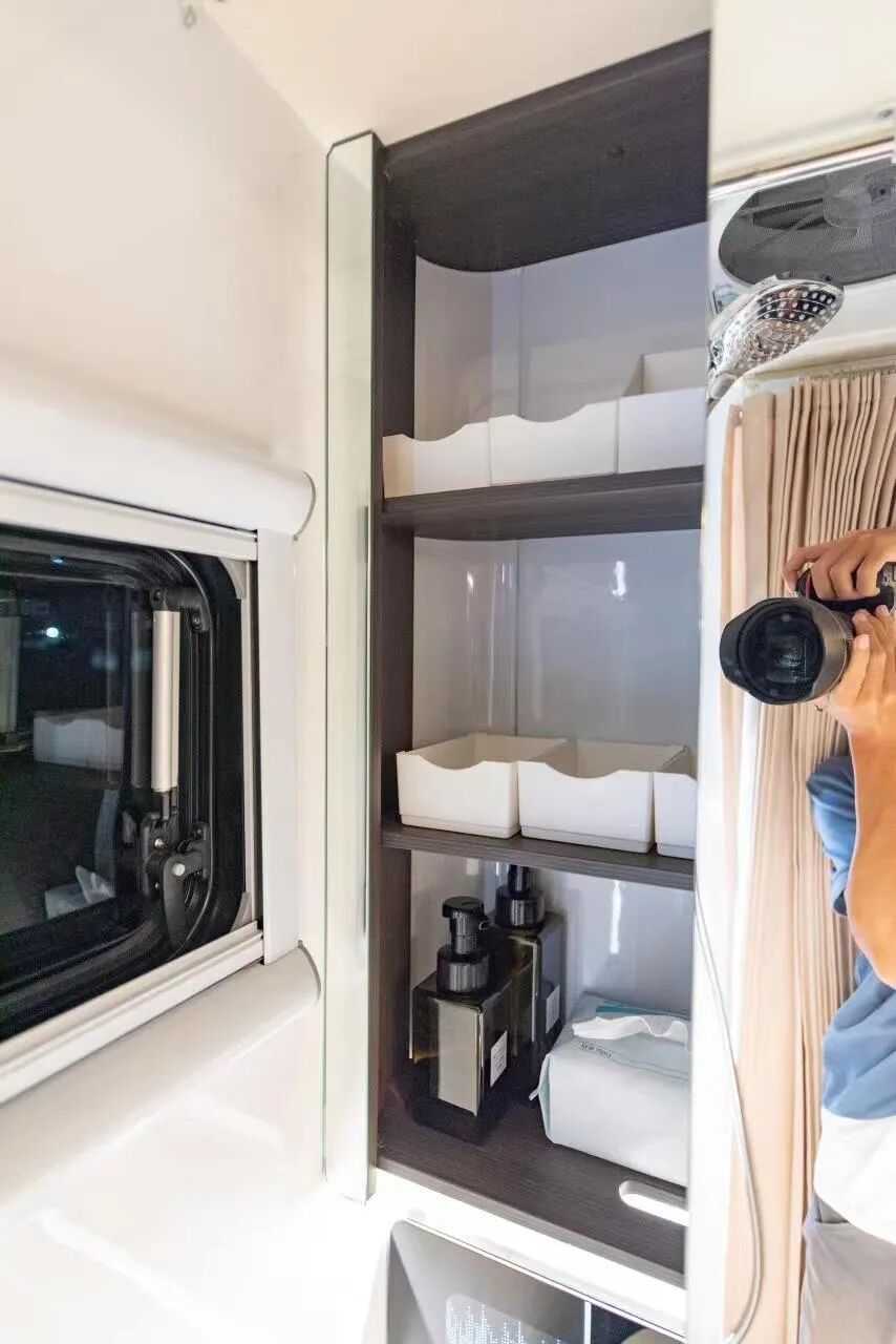 一体成型吸塑卫浴区,内部配备淋浴器、水龙头、毛巾架、洗漱池、浴帘、折叠挂衣杆等设施;洗手池上方的卫浴镜可以滑动,打开后内部是储物格,可以收纳一些常用的洗漱用品。