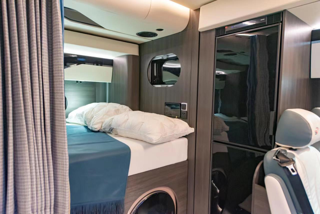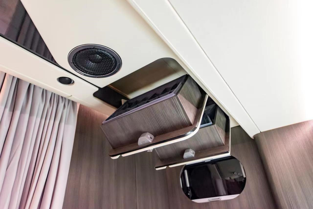 尾部休息区设有横床,拓展后尺寸宽裕,可以达到2230x1150mm,可满足多人睡眠休息;床的三面都设置了车窗,保证睡眠空间的采光通风;顶部同样配有丹拿音响,躺在床上也可以观影。