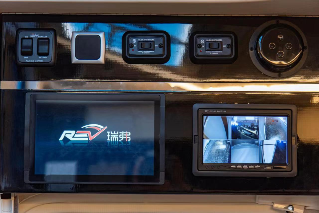 整车水电触屏控制设置在中门上方,上方还有机械式操作开关,保证水电控制随时可以稳定使用;侧面六路监控方便实时了解户外情况,保障旅行安全。