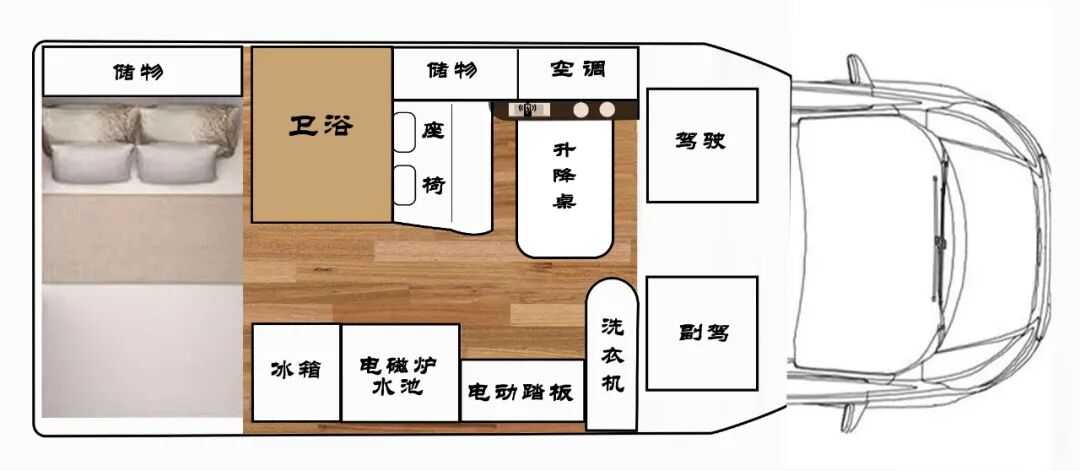 车内布局如下图,从前至后依次为驾驶区、会客区、厨房区、卫浴区以及尾部的休息区。