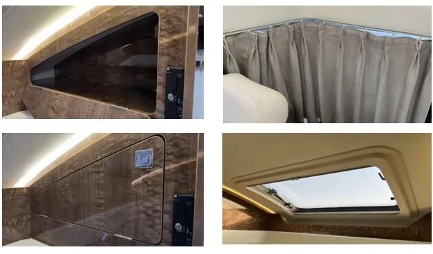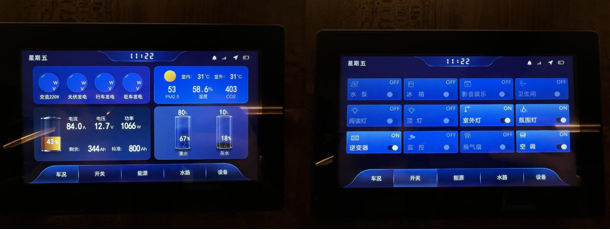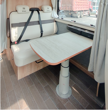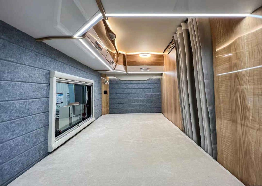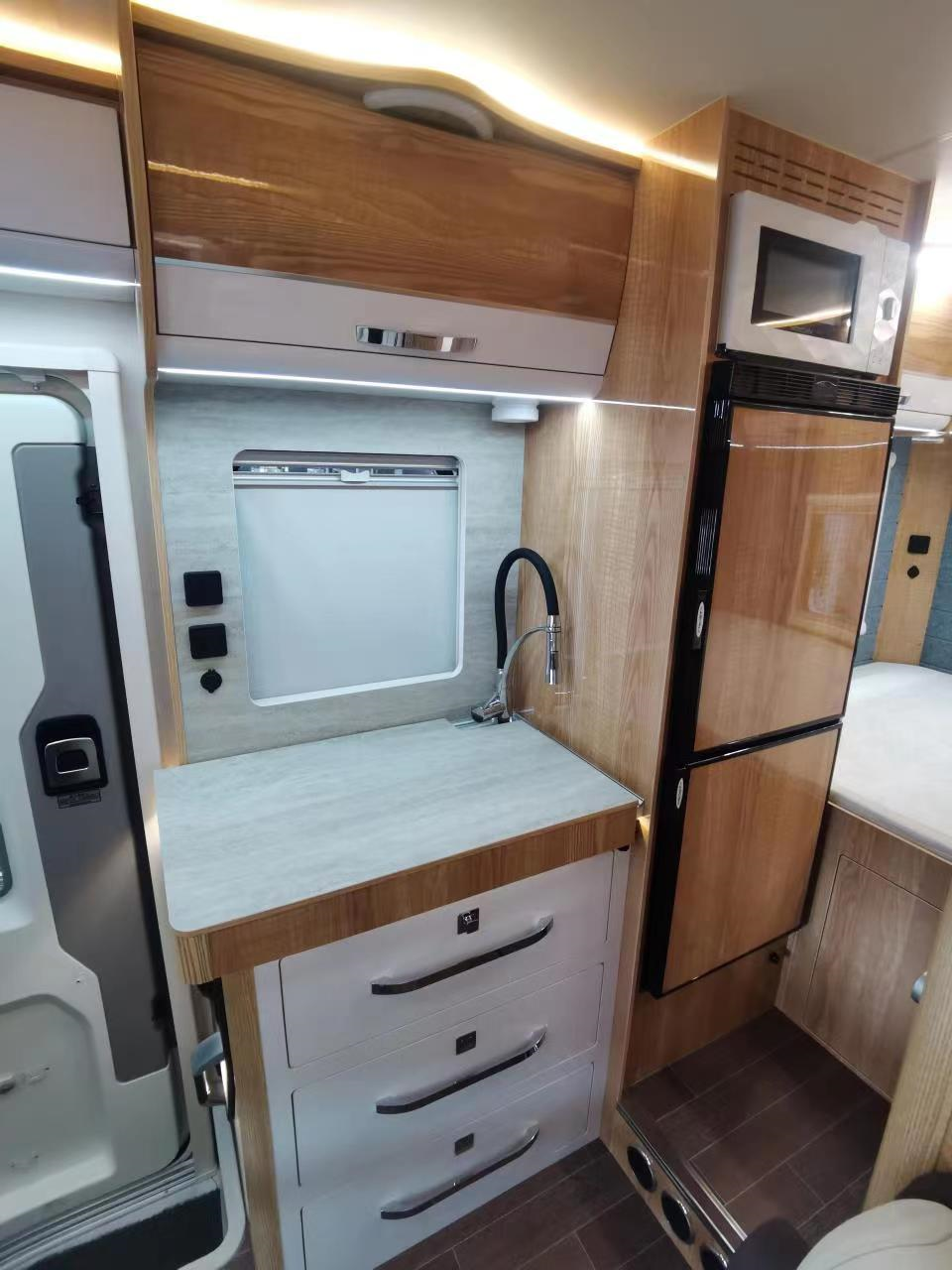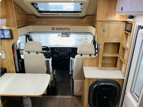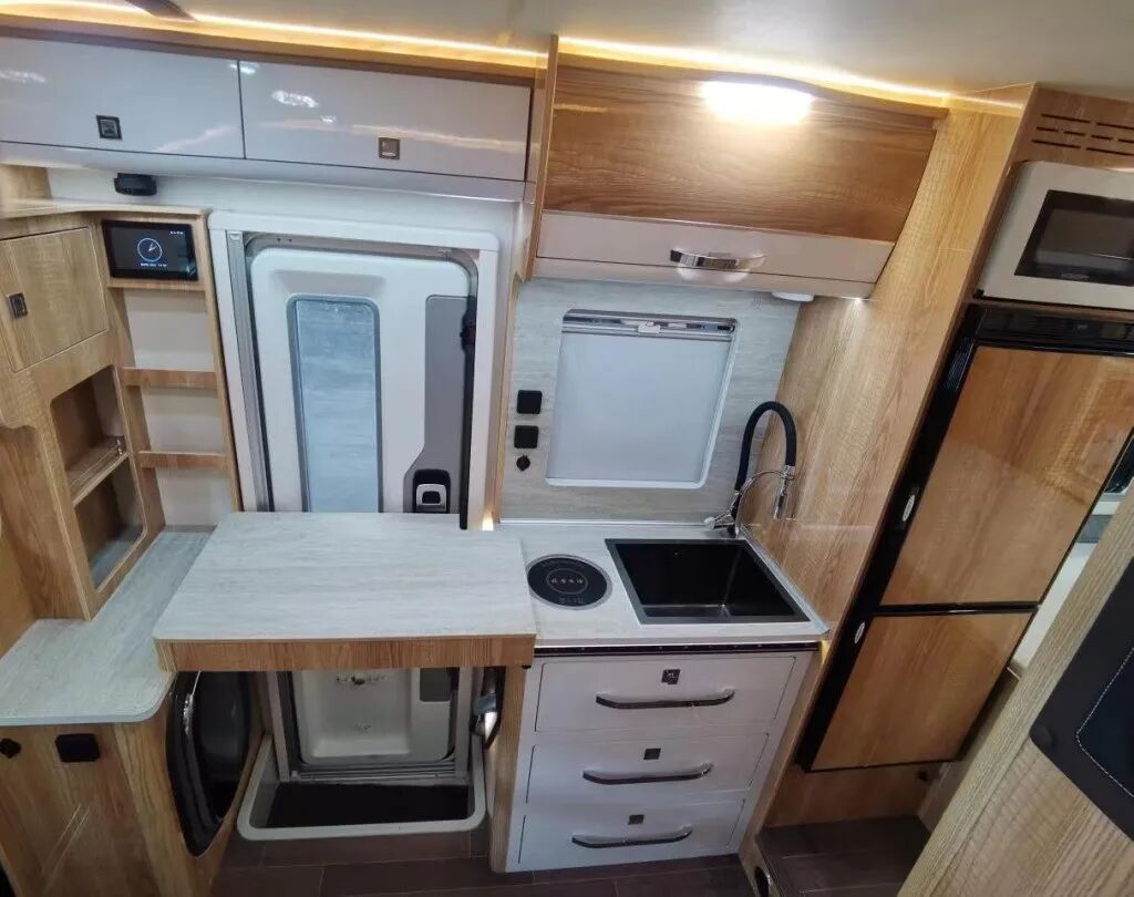 进入生活舱的方式有两种,一是从驾驶舱的贯通式过道进入,另一种便是通过房车专用乘客门了;整车内饰采用环保、轻质、阻燃、高光板材,家具圆弧设计,降低碰撞危害,空间极致利用。
