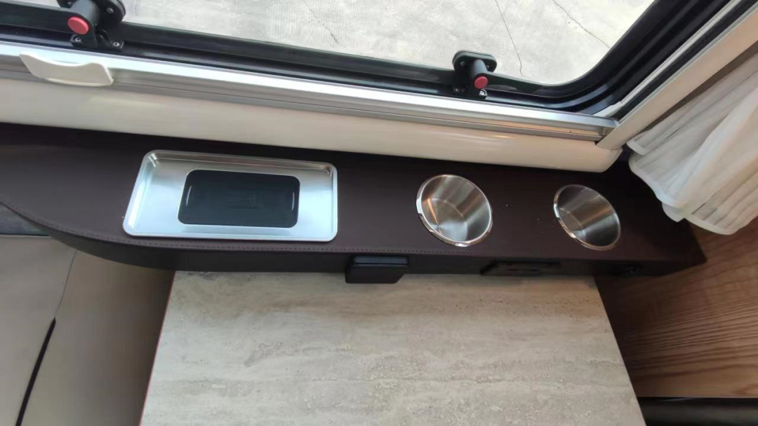 茶几侧边配有220V+12V+USB多规格取电口和手机无线充电,无论在外游玩或是驻车休息时,都不用担心手机没地方充电啦。