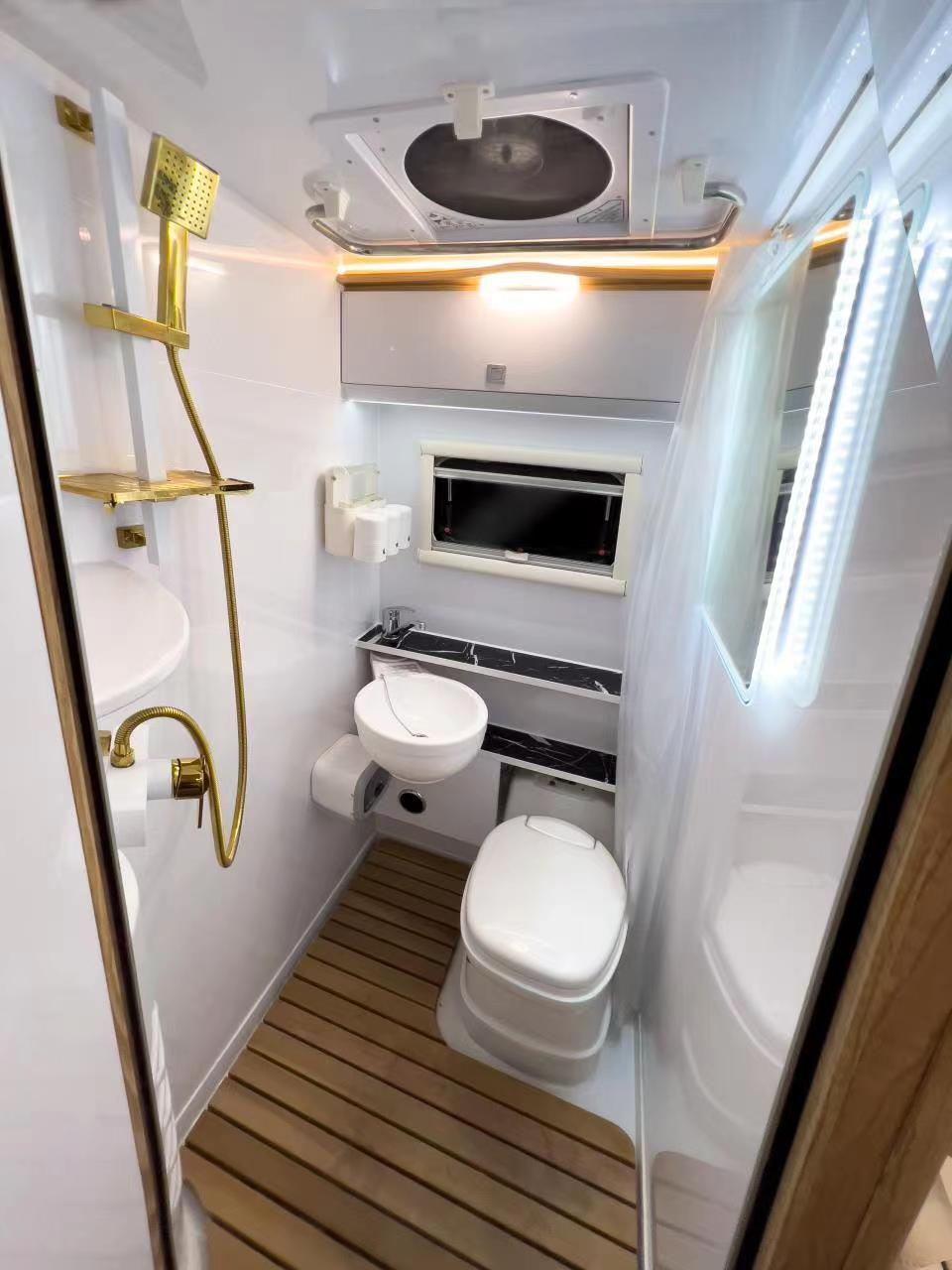 独立卫浴间在会客厅及休息区的中间,内部配有ABS吸塑可旋转水槽、冷热水独立水龙头和花洒、梳妆镜和触摸式镜前灯、卫具置物盒和顶置储物吊柜、照明灯、晾衣绳以及自带17L黑水箱的赛特福德盒式马桶等,顶部则是独立暖风出风口,可以保持卫生间内空气流通,使内部环境干净整洁不潮湿。
