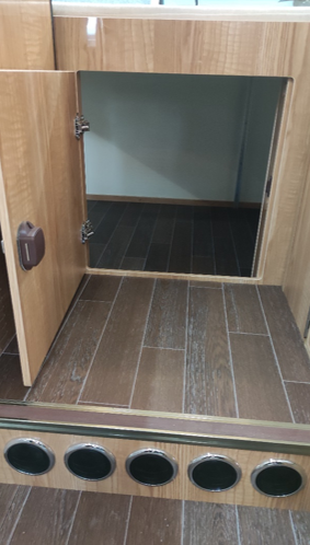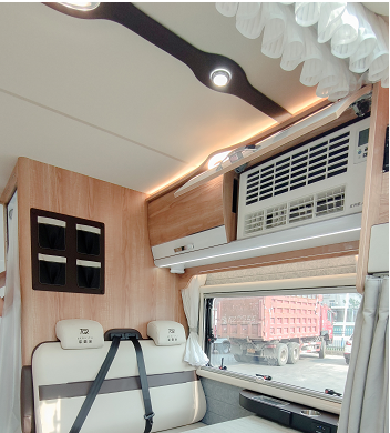 会客区的上方装有豪华双开门吊柜,可存放路上吃的零食,小孩子的玩具,日常生活用品等,且吊柜上装有锁扣,不用担心行车过程中东西掉下来;在其侧面装有内置12V分体式变频空调,冬暖夏凉。
